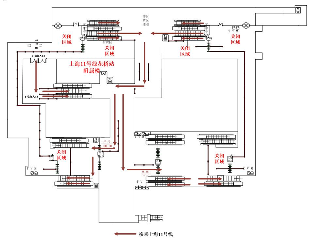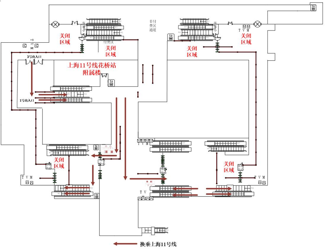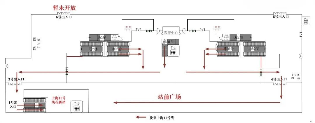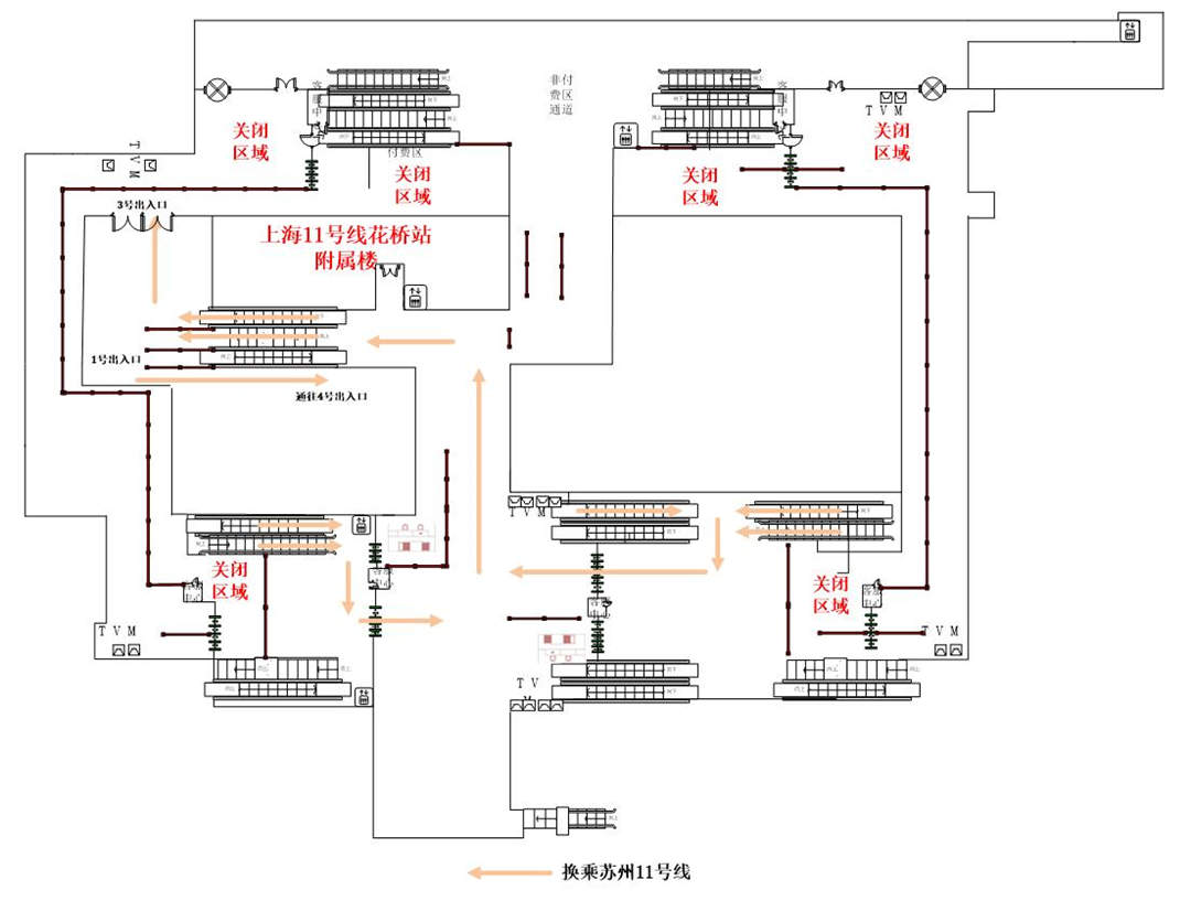 通过出站闸机后,从3号口、4号口出站至上海花桥站1号口进站换乘。