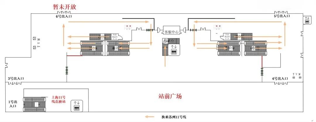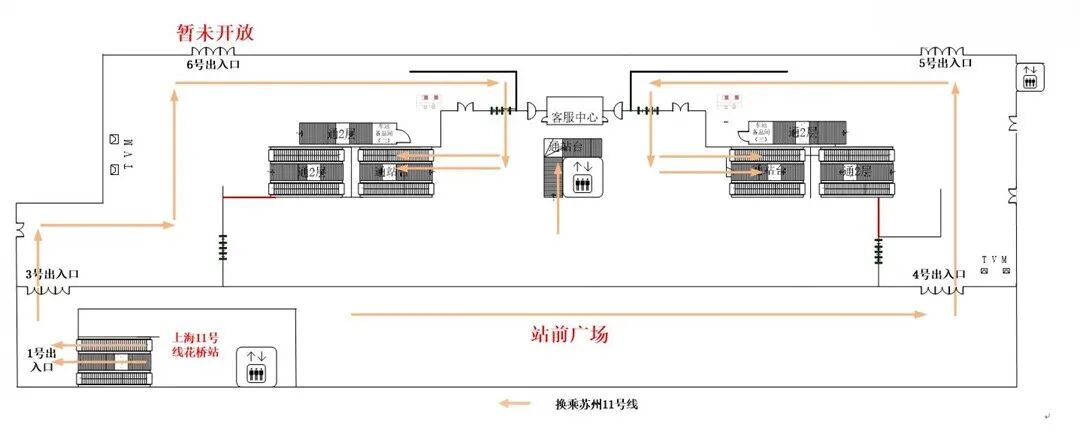 通过出站闸机后,从1号口出站后至苏州花桥站3号口、4号口进站换乘。