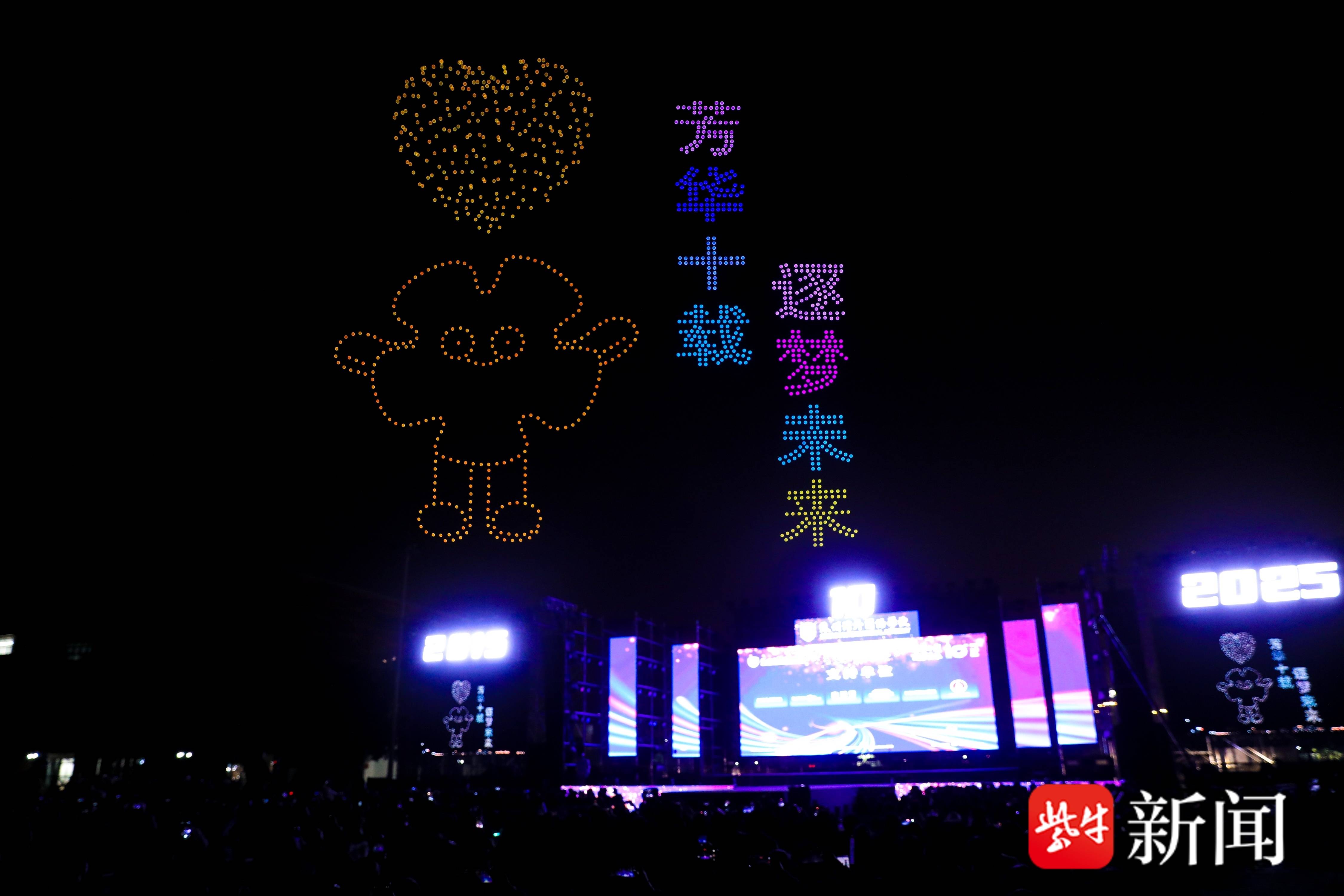 当校歌《因为有你》的旋律响起,全场观众点亮手中的星光,汇成一片璀璨星海。《星辰大海》的副歌回荡在夜空时,数百架无人机腾空而起,组成“奔跑者”“旋转星云”“红塔与花环”“湾外校徽”“湾宝”等图案,为十年校庆送上最浪漫的祝福。