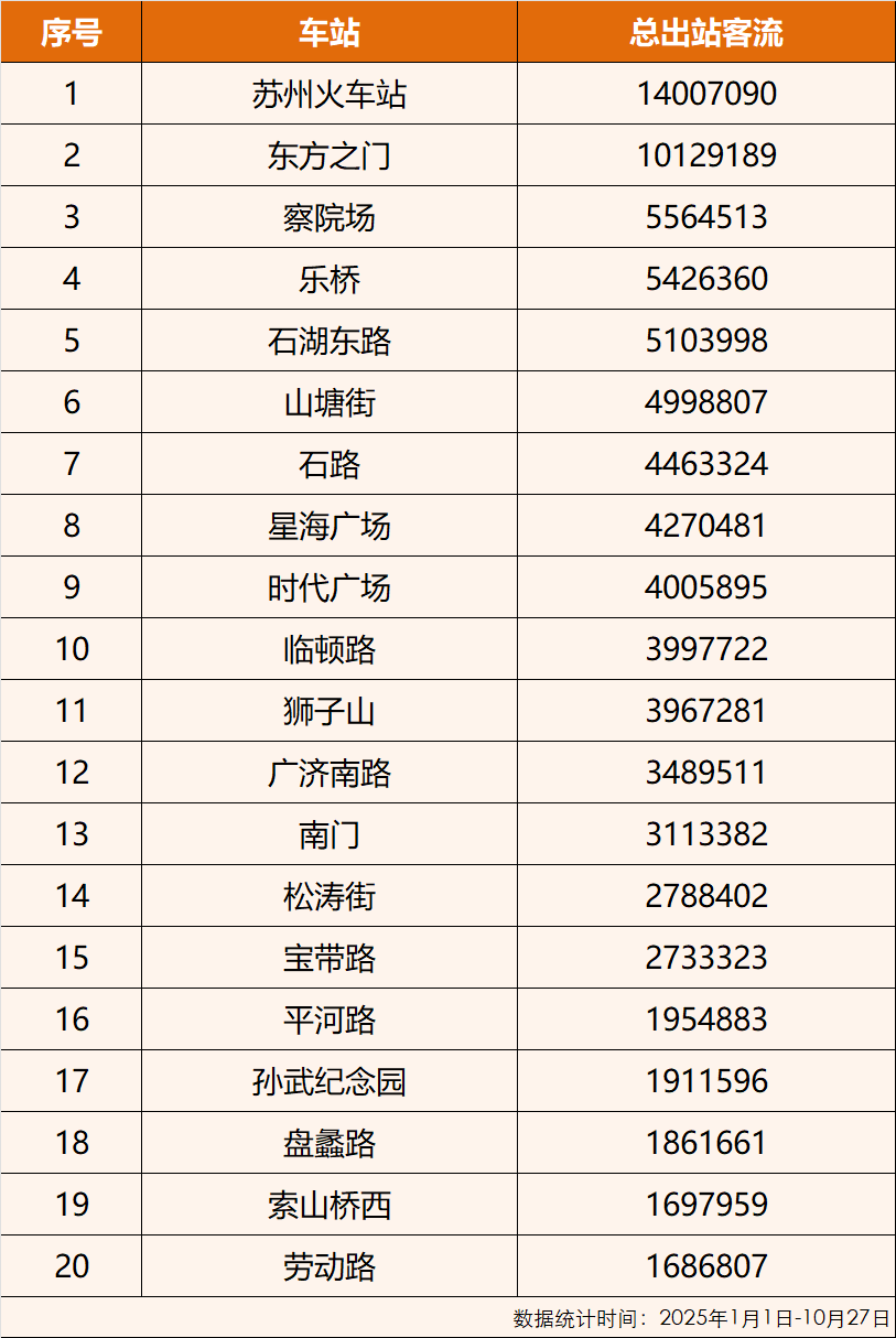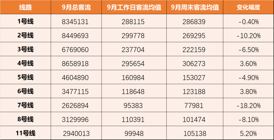 1号线9月总客流834.5万,工作日和周末几乎没波动,工作日送打工人去园区和新区CBD,周末拉游客去打卡金鸡湖、平江路,堪称“职场与休闲两手抓” 的均衡选手!