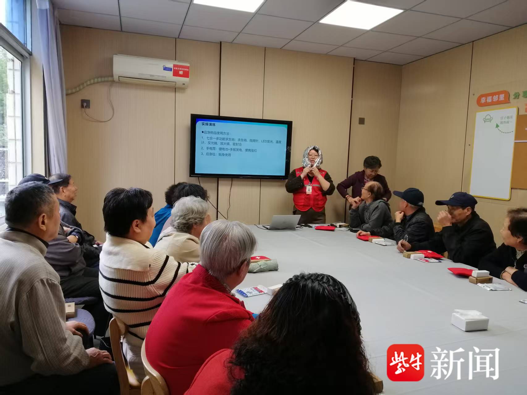 本次活动的场地选在了“万年家”睦邻中心,10月底向居民开放的睦邻中心设有乐龄茶馆、居民活动室、培训室,是兼顾居民活动、便民服务、居民议事、青年夜校于一体的便民空间,为丰富居民文化生活增添了新的好去处。培训一开始,志愿者老师向大家播放了一段火灾逃生视频,并结合居民日常生活场景和火灾发生中可能遇到的情况,展开了“火灾阵地求生法”教学:当客厅电器短路引发火灾的情况下,被困人员应当先切断电源总开关,再使用水灭火,以防止漏电触电;当火势无法控制时,切勿留恋财物,必须尽快从安全通道逃生,等所有人员逃出后,紧闭大门,防止浓烟进入逃生通道,延缓火灾蔓延,同时立即拨打火警电话求助;当被困在高层建筑的房间,无法逃生时,要使用打湿的毛巾等物堵住门缝,向门上泼水降温,延缓门被烧穿的时间,等待救援;如果门被烧穿,要清理掉窗边的易燃物,来到窗边用棉被隔绝热量保护身体,同时使用拖把杆、窗帘杆等空心管伸出窗外呼吸新鲜空气,尽最大可能保护自己,等待救援……
