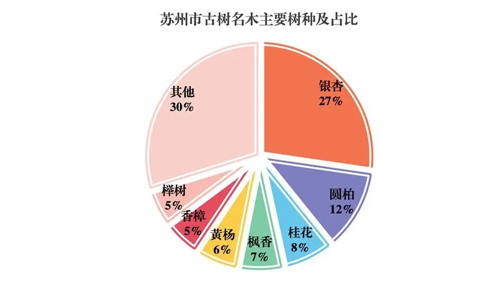 苏州千年以上树龄古树37株。从树种分布上来说:苏州古树主要树种有银杏、圆柏、桂花、枫香、黄杨、香樟、榉树等。