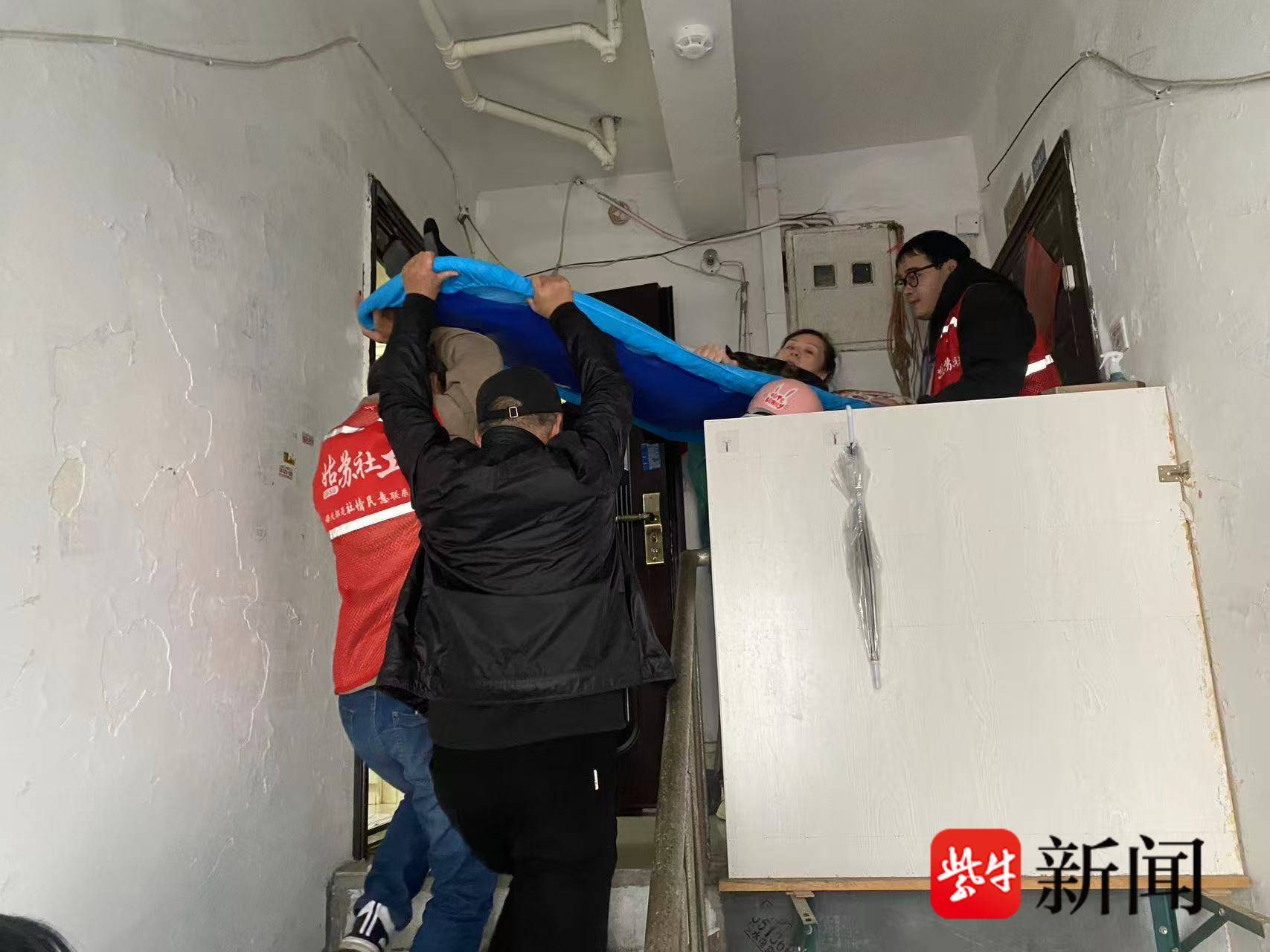 尽管楼层不高,但为确保袁阿姨的舒适与安全,短短三层楼梯,一行人小心翼翼地行进了数分钟,直至袁将阿姨平安稳妥地安置在自家床上,所有人才放下心来。