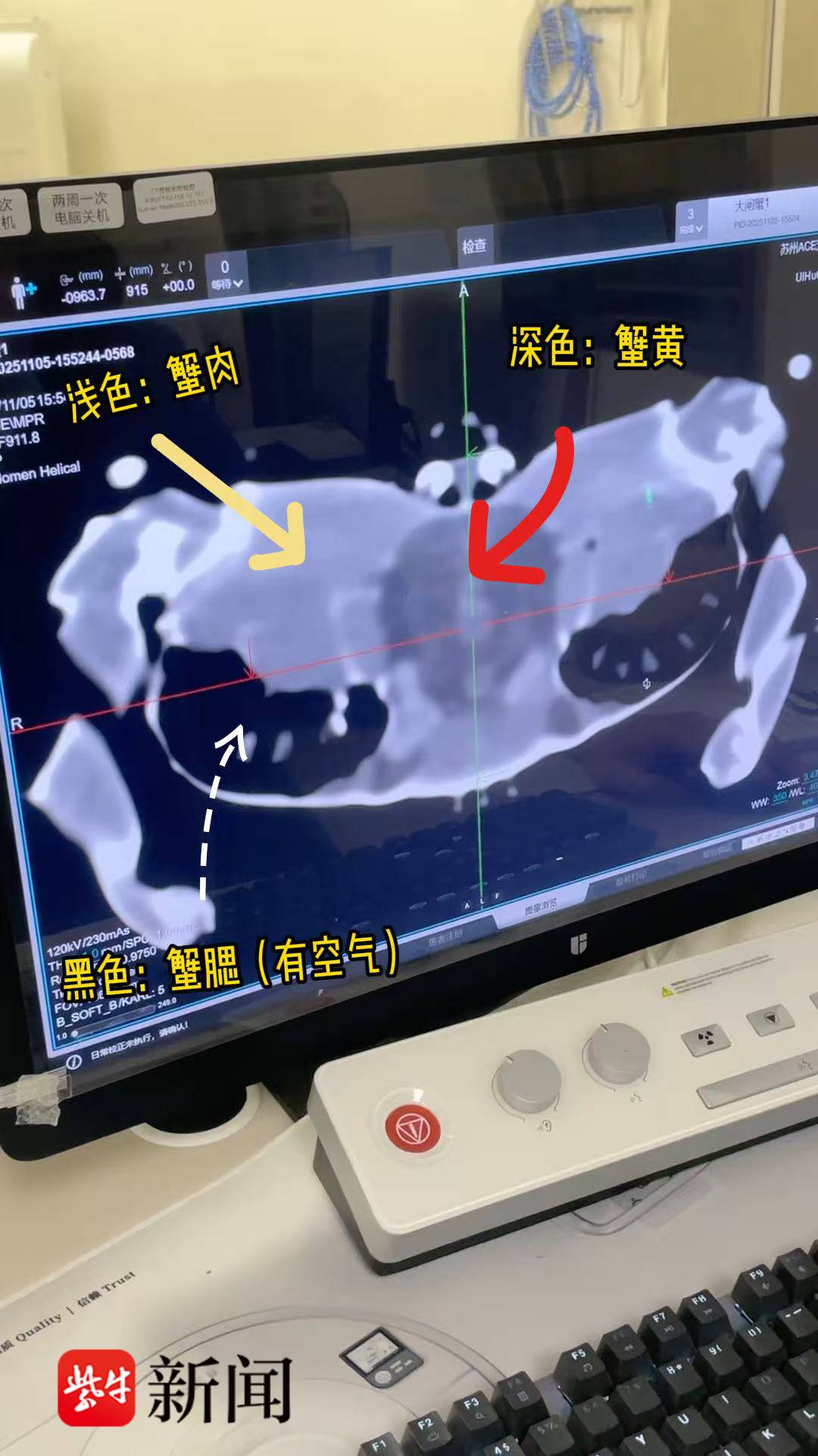 郑朱慧引领记者来到电脑旁,操作起电脑,将当时扫描螃蟹所得到的CT影像清晰地展示在屏幕上。她向记者介绍道,由于蟹黄和蟹肉在物质密度上存在明显差异,所以在CT影像里,二者能够被精准且清晰地区分开来。郑朱慧指着影像介绍,此次扫描将螃蟹进行了横断切割,共分成了10层,整个影像就像一张“蟹体剖面图”,螃蟹内部的情况毫无保留地呈现出来。“影像中这片呈黑色的区域是蟹鳃,这片颜色稍浅一些的是蟹肉,而颜色较深的这片区域,就是蟹黄了,位置和形态都一目了然。”