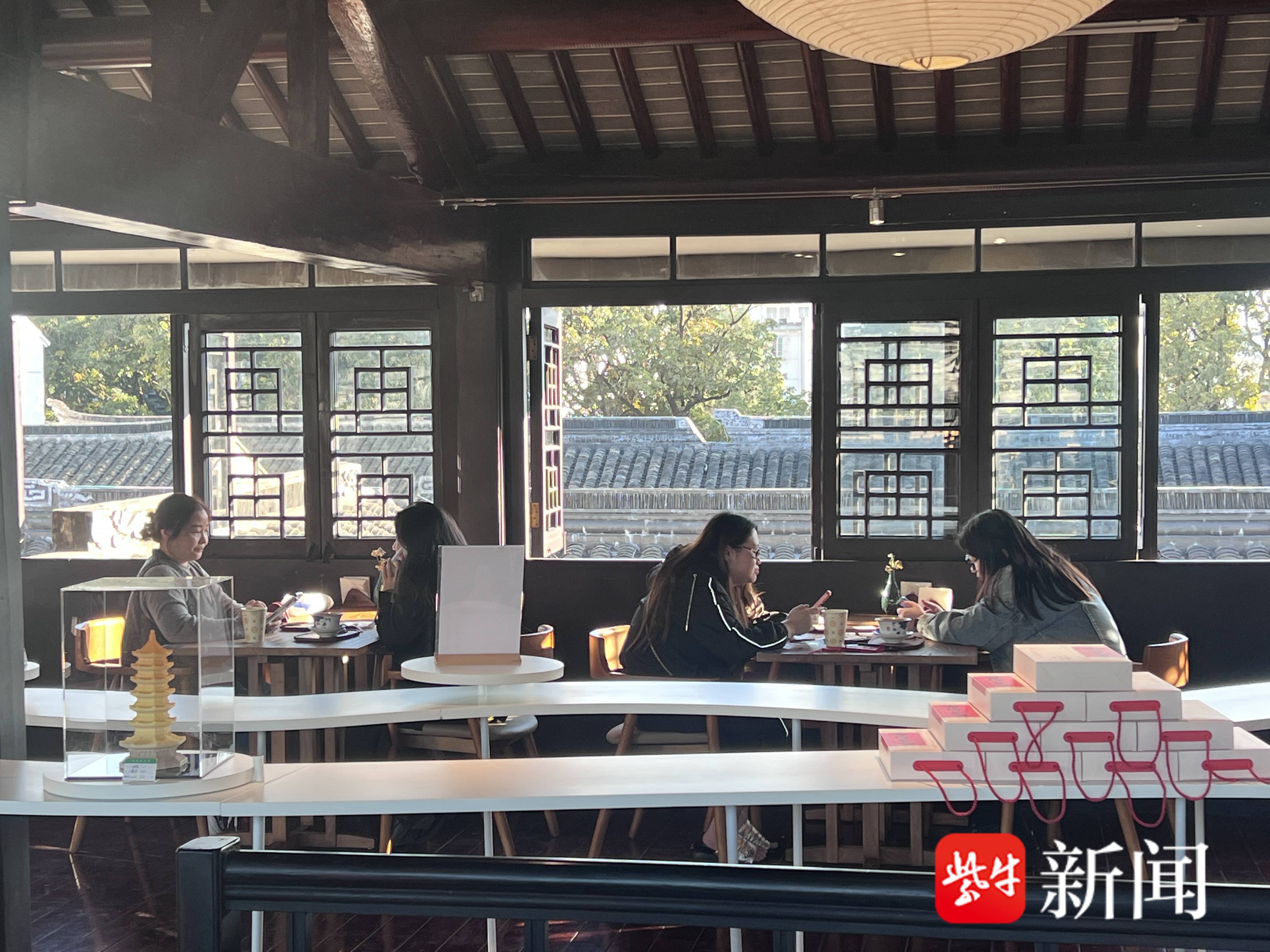 33岁的小朱点了一份咖啡和“盘门”款蛋糕,来到户外茶桌开启体验。她一边品尝一边和家人视频通话:“来苏州工作3年了,家里人最近想来苏州游玩,趁着天气好,我提前来踩个点!”置身于“随手一拍便是江南壁纸”的苏式空间,这次体验让小朱收获了意外的惊喜,没想到芒果口味的“盘门”口感绵密像冰淇淋,入口即化,“外观做得非常精致,可以说完全复刻了,拍照也太出片了,准备和家人一起来感受穿越时空的浪漫。”