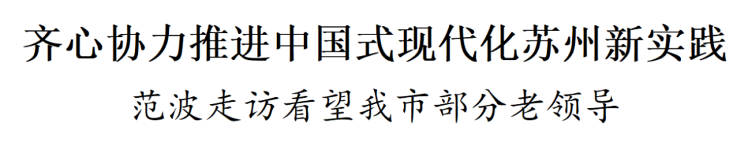 老领导们一致表示,真诚欢迎范波同志到苏州任职,将全力支持市委工作,积极建言献策。相信在市委坚强领导下,全市人民凝心聚力、团结奋斗,一定能够推动苏州各项工作继续走在前列。