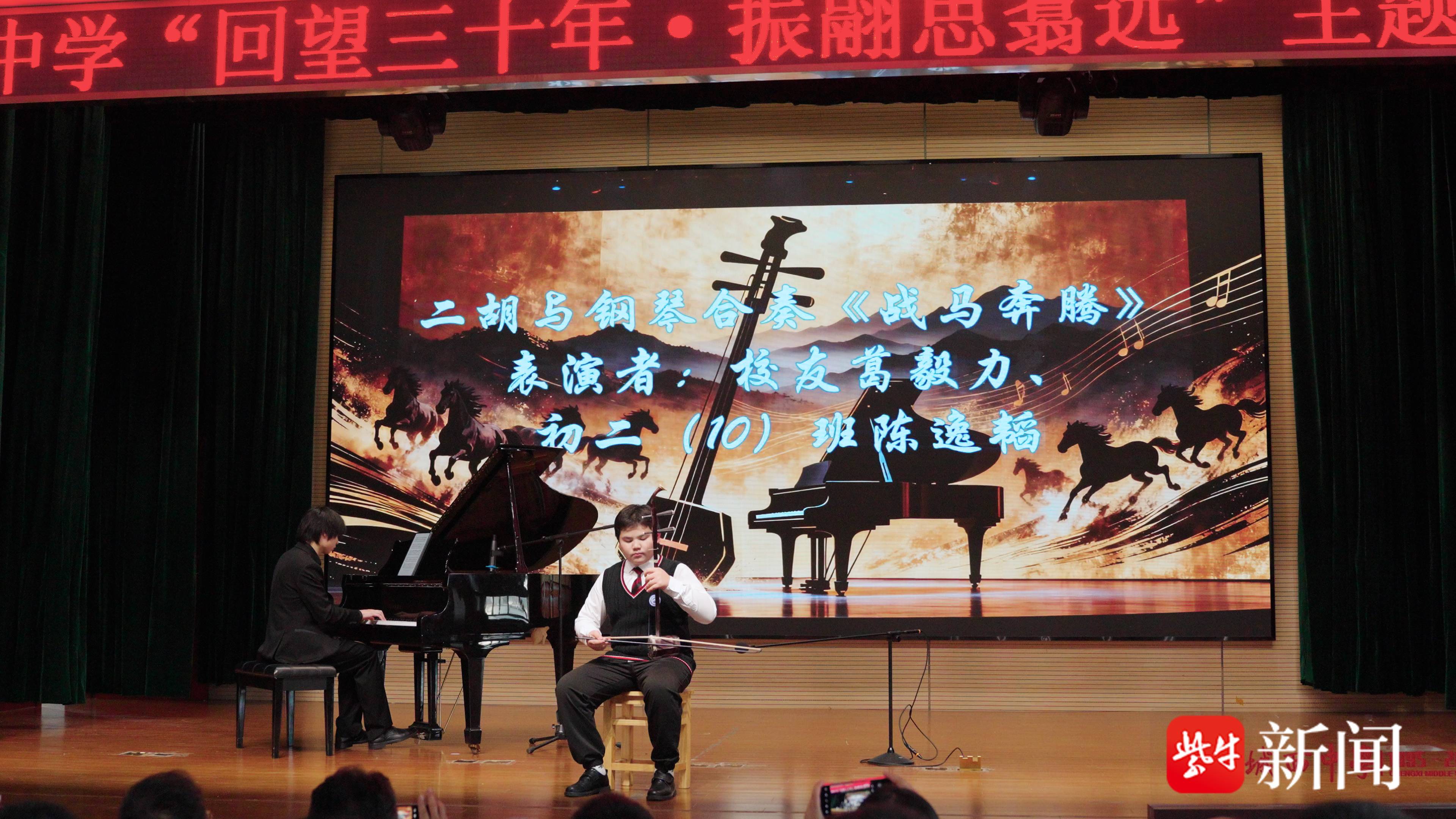 现场,城西中学健美操社团、舞蹈社团的同学们带来了精彩的表演。初二(6)班带来合唱《世界赠与我的》。校友葛毅力和初二(10)班的陈逸韬演绎二胡、钢琴合奏《战马奔腾》。校友赵圣和城西学子黄子傲、程诗琪、苏浩宇联合演绎《吾·悟》,让观众在歌声中感受传承的力量。城西教师代表深情朗诵《三十载正青春,城西再图南》,将活动推向高潮。