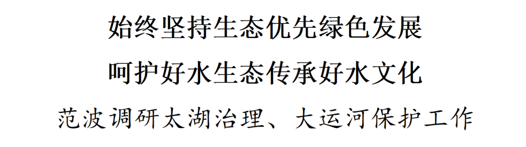 在随后召开的座谈会上,范波对相关工作表示肯定。他说,习近平总书记高度重视太湖治理、大运河保护,多次作出重要指示批示,为我们做好相关工作提供了根本遵循。要站在“国之大者”的高度,认真学习贯彻习近平总书记关于太湖治理、大运河保护的重要指示批示精神,敬畏历史、敬畏文化、敬畏生态,不断提高政治自觉、思想自觉、行动自觉,切实推动各项工作取得新提升。