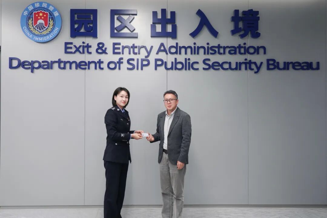 11月13日,苏州海狸生物医学工程有限公司董事长兼CEO任辉博士从苏州工业园区公安分局出入境管理大队民警手中接过全市首张多次往来港澳人才签注。