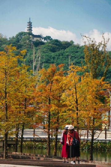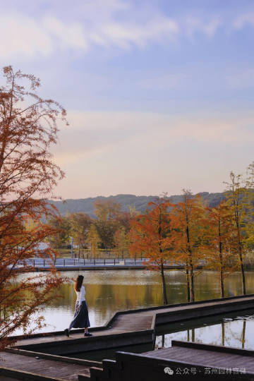 湿地植物园池杉栈道:木栈道穿梭在池杉林中,今年新增水雾景观,上午7:30-9:00或下午2:30-3:30打卡最佳。贴近地面拍落叶前景避开人群,或用广角镜头拍“上方山+楞伽塔+池杉+水面”全景,秋日壁纸直接有。