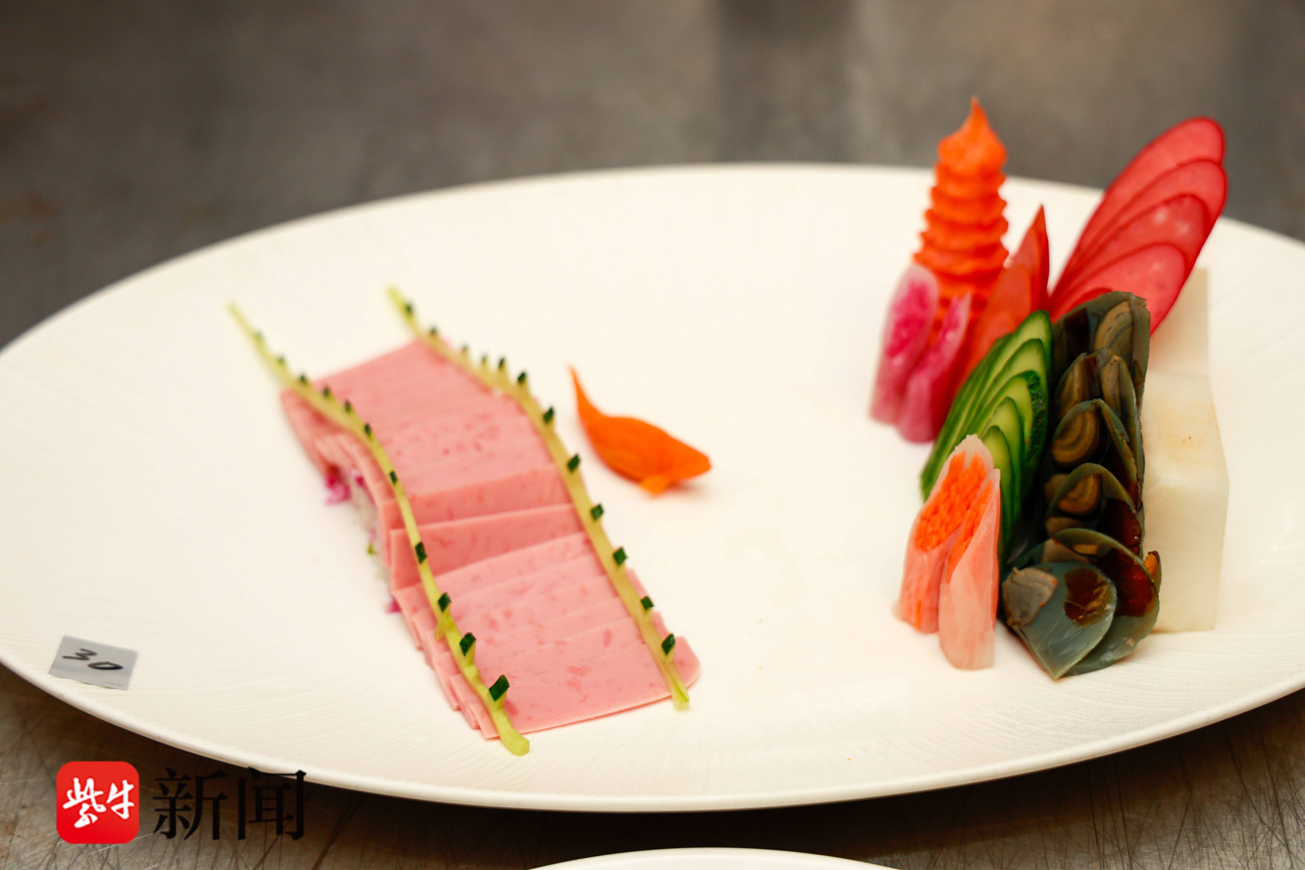 下午的个人赛场上,刀光勺影间尽显真章。选手们以最普通的黄瓜为考题,细腻均匀的刀工令人赞叹;摆盘环节则化身艺术创作——有人用酱汁勾勒山水,有人以果蔬雕花点缀,凉菜区的心形摆盘与扇形构图交相辉映。更有机智者突破常规:火腿片搭成苏式拱桥,胡萝卜雕出玲珑宝塔,整桌菜俨然微缩园林。