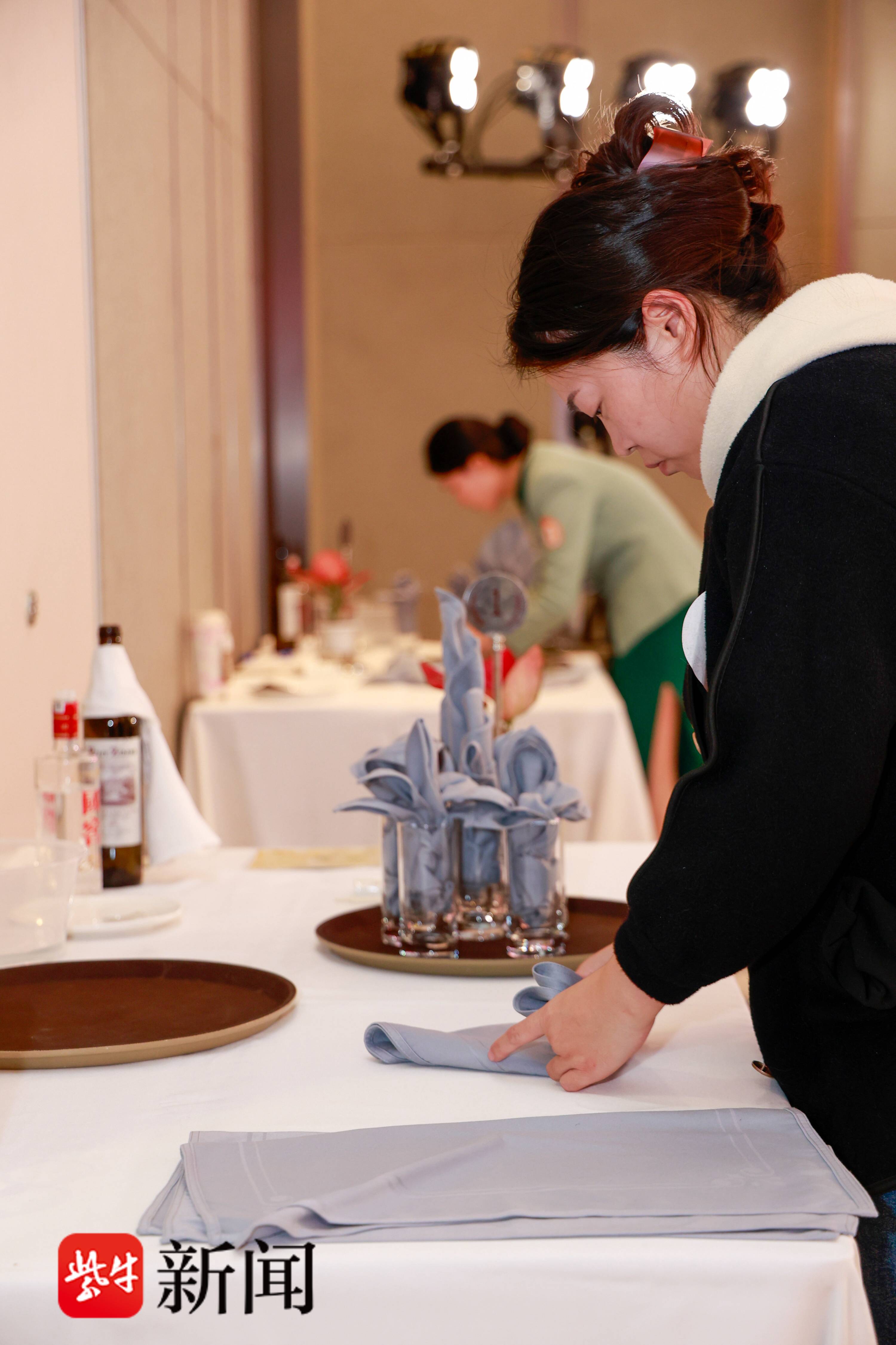服务员职业技能比赛同样精彩:桌布抛掷如浪涌,瞬间铺展平整;餐具碰撞清响中,刀叉与高脚杯精准落位,连餐巾折花都暗藏玄机——天鹅振翅、玫瑰含苞,服务美学在此具象化。选手们托盘行走如风、摆台精准如尺,服务流程规范而富有温度。一位评委感叹:“好的服务不是程式化,而是让人感受到尊重与关怀。”