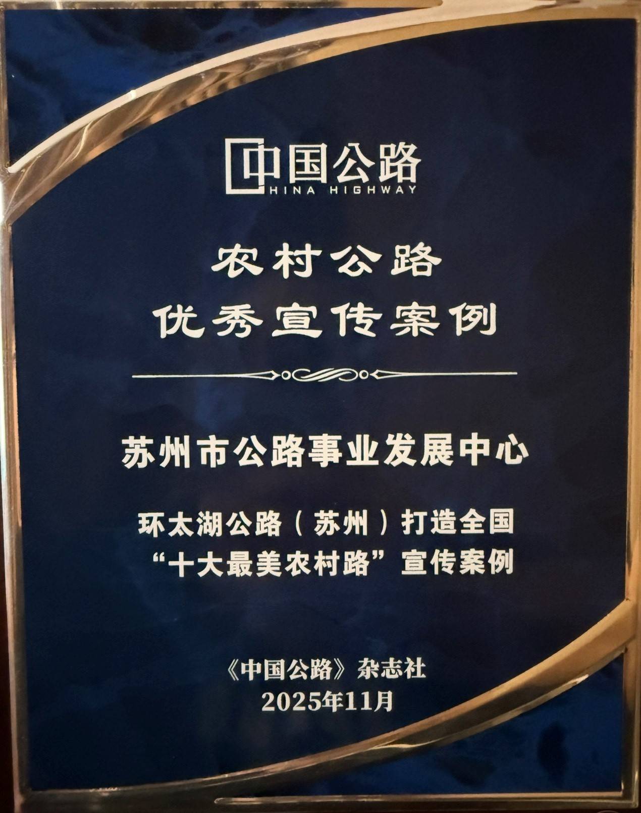 11月19日,由《中国公路》杂志社主办的首届公路行业优秀宣传案例征集展示活动在重庆举行,苏州市公路事业发展中心报送的“环太湖公路(苏州)打造全国十大最美农村路”宣传案例经推荐、严格筛选、综合评议等环节,从400个案例中脱颖而出,获评农村公路优秀宣传案例。