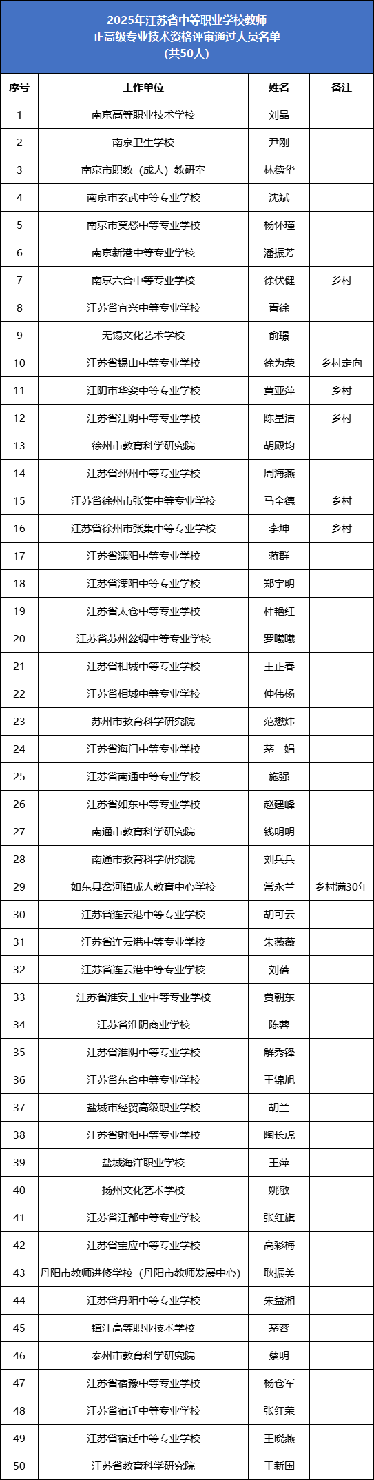 2025年11月16—17日,经江苏省中小学正高级教师高级专业技术资格评审委员会评审,通过许露等482位同志中小学(幼儿园)正高级教师任职资格。经江苏省中等职业学校教师正高级专业技术资格评审委员会评审,通过刘晶等50位同志中等职业学校正高级讲师任职资格。