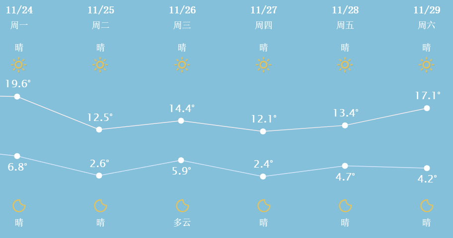 11月23日至24日,一股冷空气自西向东影响我国大部地区,北方局地降温可超10℃,中东部晴朗天气持续。此外,25日至27日以及29日前后还将有冷空气影响我国,气温将频繁波动。