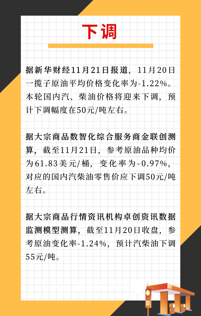 今日(11月24日)24时,2025年第23轮成品油调价窗口将开启。本轮油价怎么调?目前经过相关机构分析预测,油价调整结果可能为下调。