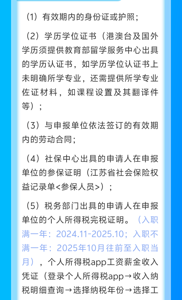 (1)税务部门出具的申请人在申报单位的个人所得税完税证明(入职满一年:2024年11月-2025年10月;入职不满一年:2025年10月往前至入职当月);