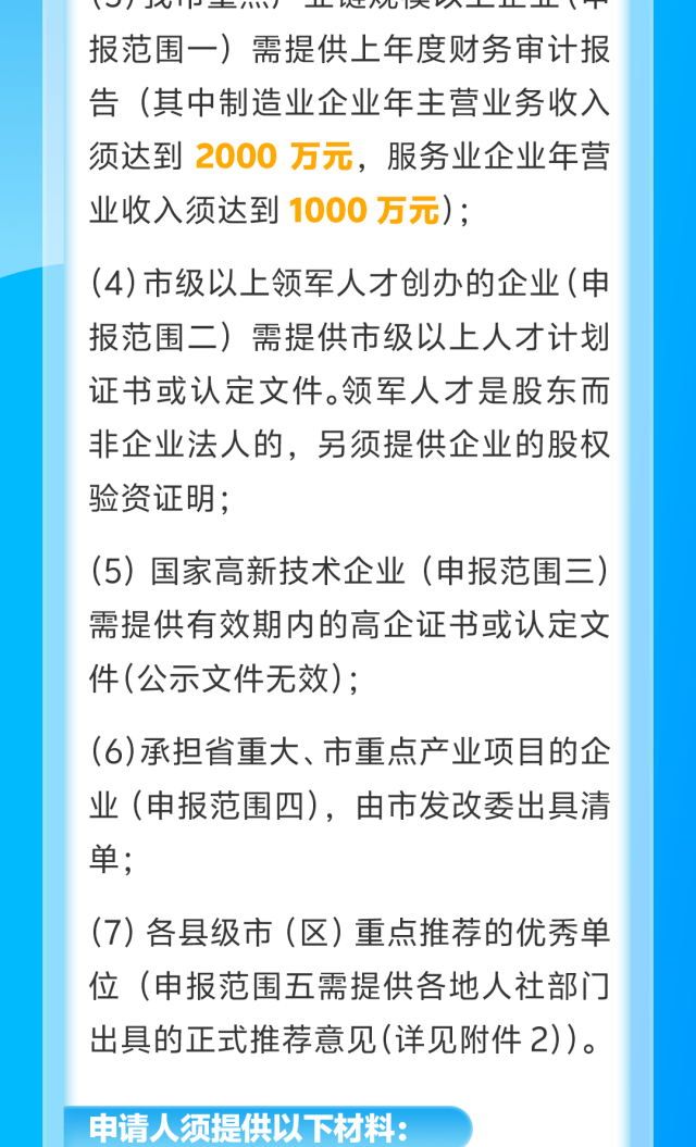 企业法人或者持股股东是国家级重大人才工程(A类)、国家级重大人才工程(B类)、江苏省双创计划(双创人才、双创团队领军人才)、姑苏领军人才(创业类)入选者是企业法人或者持股股东。如果是股东(直接持股),还需要额外提供验资报告(股东证明),验资报告需盖单位公章。