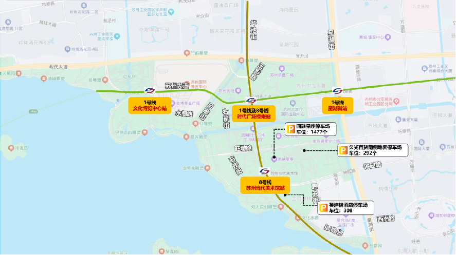 活动期间,市民可选择圆融星座停车场、英迪格酒店停车场、久光百货南侧地面停车场进行停车,车位数量有限,停车场步行至广场超450m。建议市民优先乘坐地铁8号线至“苏州当代美术馆站”,或乘坐地铁1号线至“时代广场站”下车,步行至广场观演。
