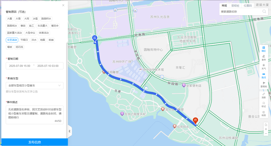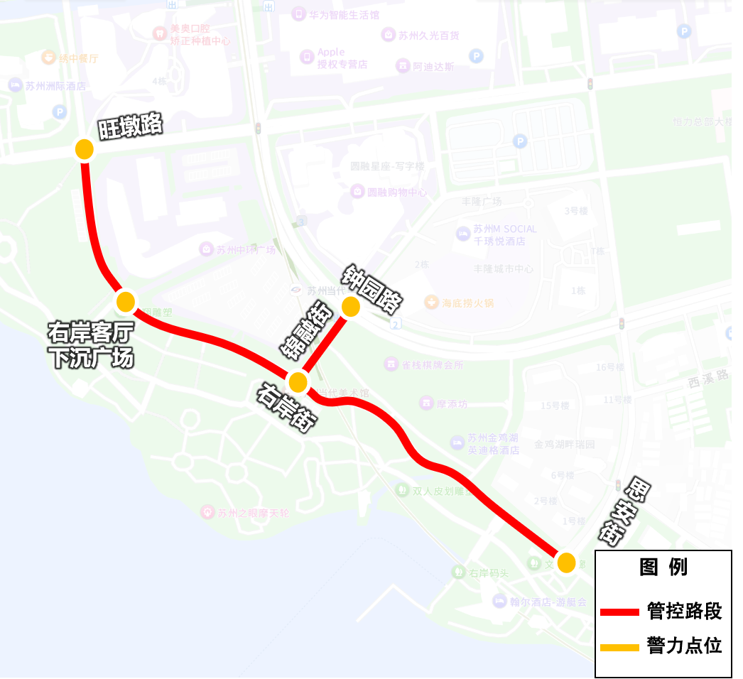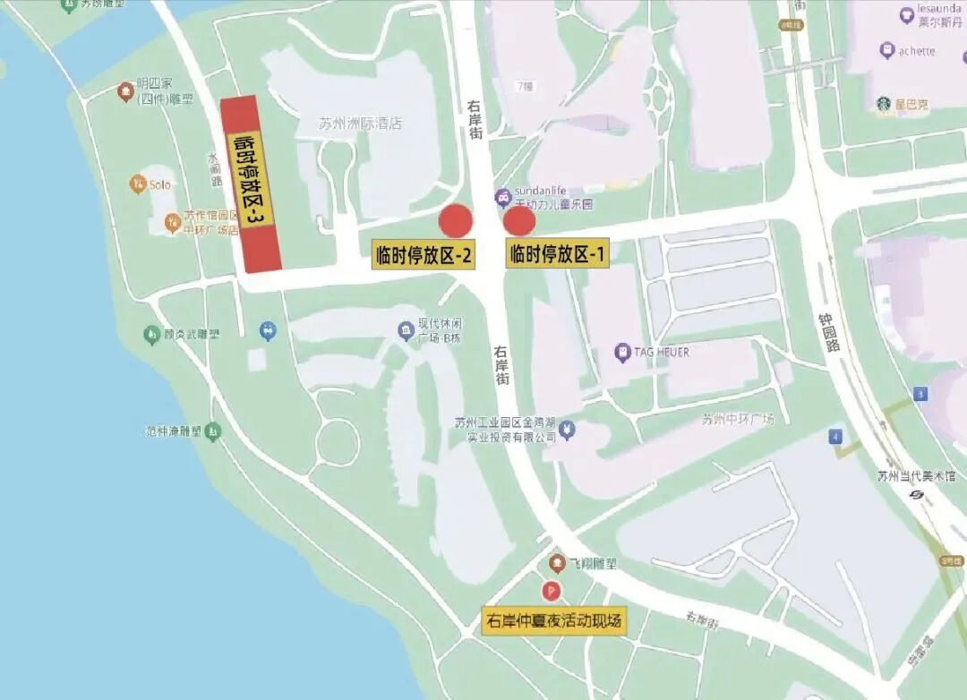 活动期间,当右岸街沿线流量饱和时,园区交警将对右岸街(旺墩路-思安街)实时封闭管制,并利用导航平台发布管制信息,指引途经车辆避开此段,选择合适的绕行路线。