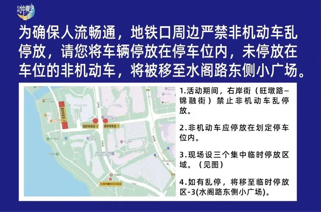 活动期间,若您骑行非机动车,请遵守现场停放规定,共同维护场地秩序。为确保人流畅通,地铁口周边严禁非机动车乱停放,车辆需停放在停车位内,具体停放位置详见 “非机动车停放提示图”。未按规定停放在车位的非机动车,将被移至水阁路东侧小广场,敬请规范停放。