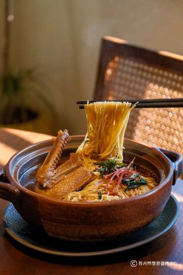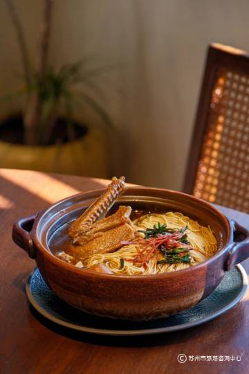 母油船鸭面,慢煨冬日的温情。烹制时,选用鲜嫩的小麻鸭,大火烧开,再小火慢炖2.5小时至鸭肉酥烂,所有的鲜味都融于这一锅暖玉般的汤汁中。将煮好的苏式细面滑入这锅精华之中,端上桌的砂锅冒着腾腾热气,面条吸饱了浓郁的汤汁,极其入味。这一锅温暖的滋味,正是抵御江南秋冬湿寒的、最妥帖的慰藉。