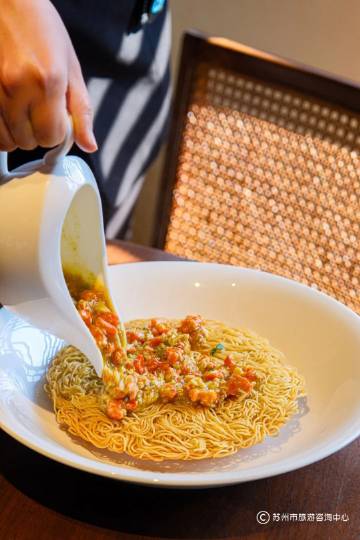 在苏式面点中,蟹粉两面黄堪称一道极具辨识度的佳品。咀嚼间,既有蟹黄的浓郁,又有蟹肉的清甜,更有面条本身的麦香与酥脆。每一口,都是对“不时不食”的风雅诠释。