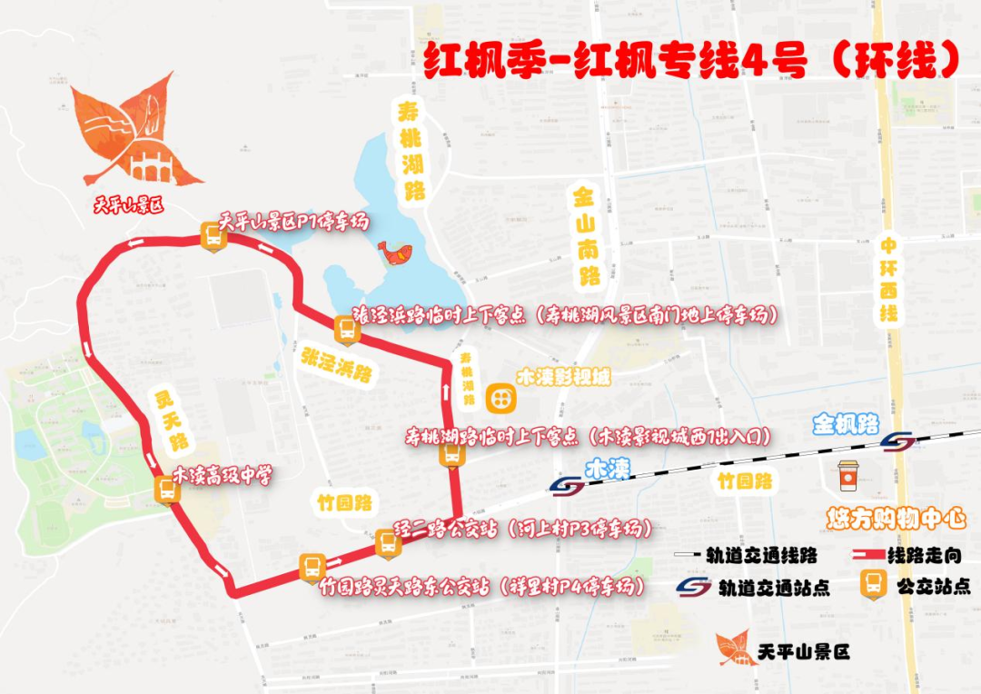 “红枫专线4号”串联起天平山、寿桃湖、木渎影视城三大热门游玩地。以8:30-17:00循环发车,10-15分钟一班,高峰动态加密,实现“一线畅游多景”。
