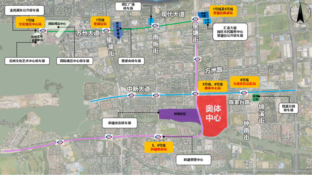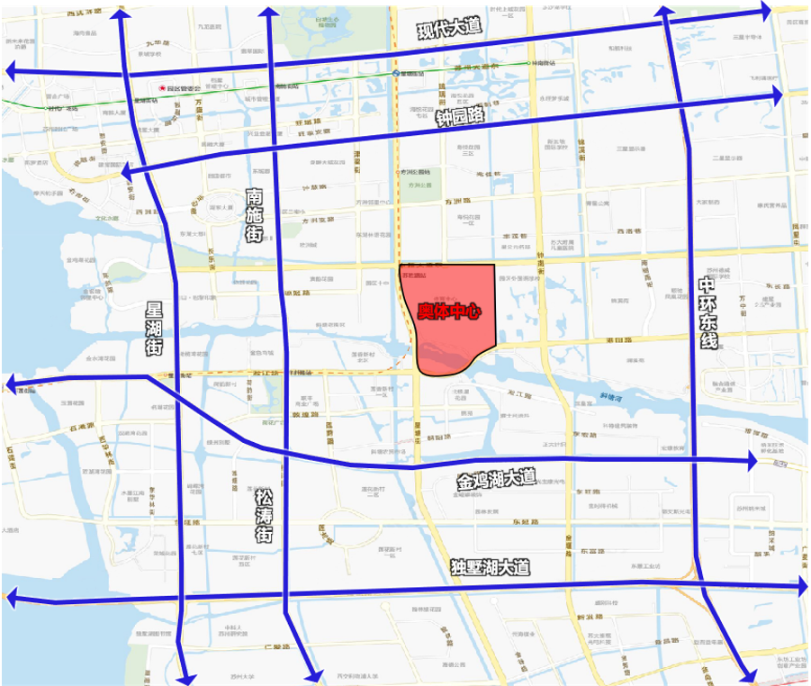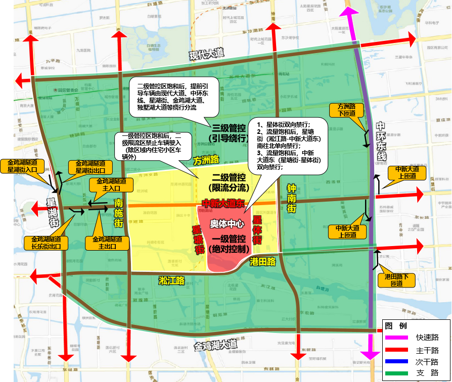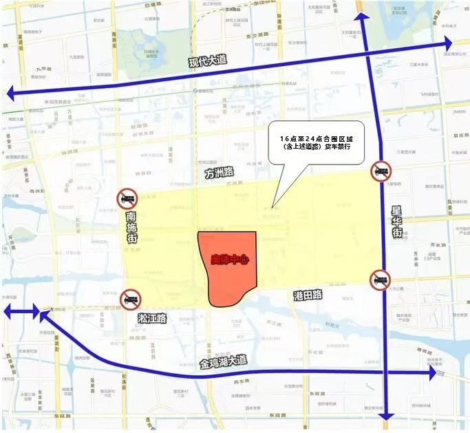 星湖街、现代大道、星华街、金鸡湖大道等道路合围区域内往奥体中心方向视情况禁止货车通行、客车限流。