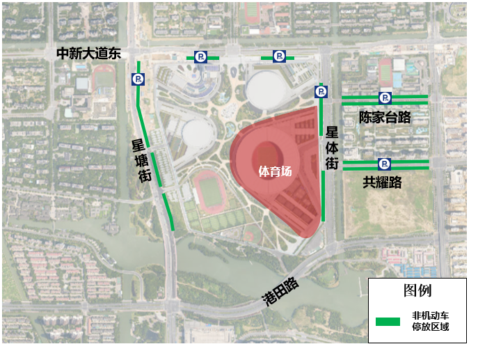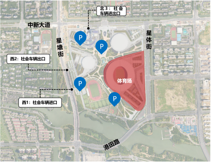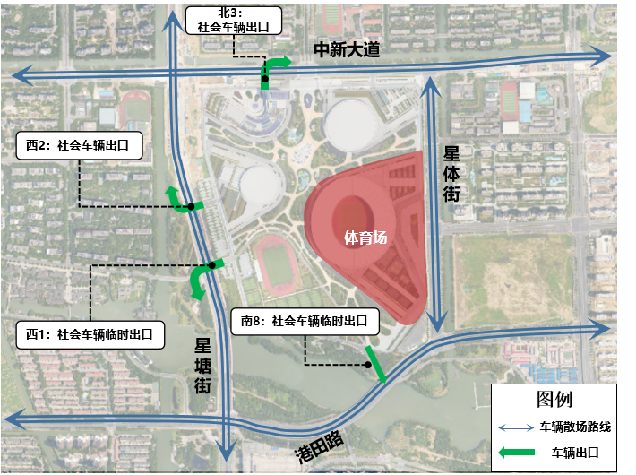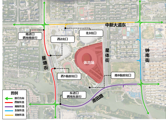 此外,部分路口将调用特殊放行方式:星塘街-中新大道东调用“南放行”,中新大道东-星华街调用“西放行”,港田路-星塘街调用“东放行”等,加快车辆驶离奥体中心。