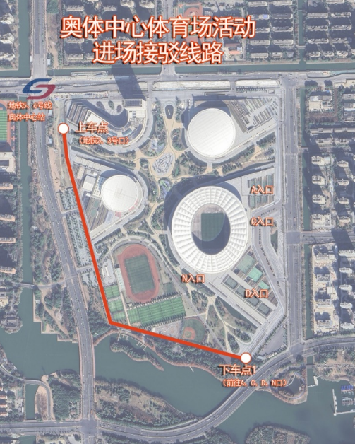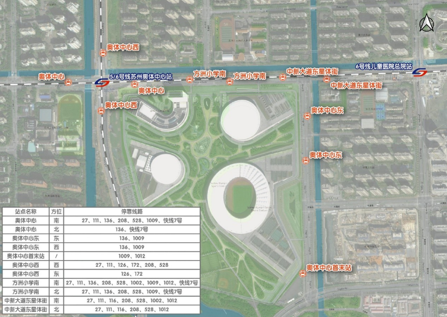 乘坐常规公交线路前往的球迷,可选择到达以下公交站点:奥体中心西、方洲小学南、奥体中心东、奥体中心、中新大道东星体街等,具体点位如下:
