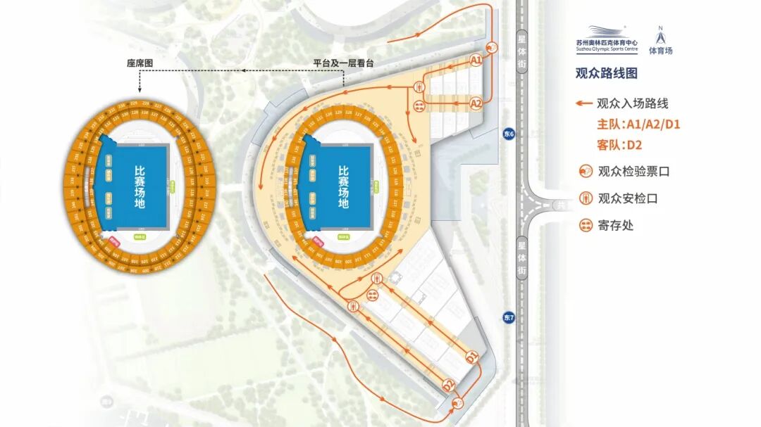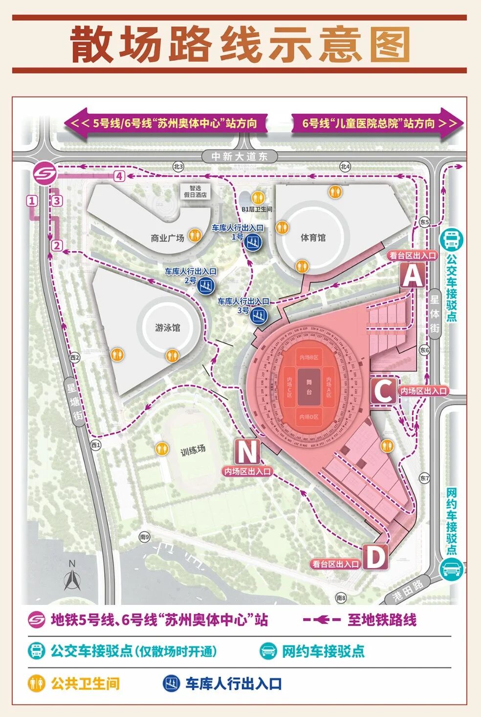 苏州公交特别开行“足球对抗赛接驳线”,地铁+公交接驳,10分内直达赛场:乘坐地铁5、6号线在“苏州奥体中心”站2、3、4号口出,根据现场标识和公交管家指引,换乘专属接驳车,16:30起循环发车,车满即走,拒绝等待。全程走内部道路,10分钟内即可直达体育场入口。