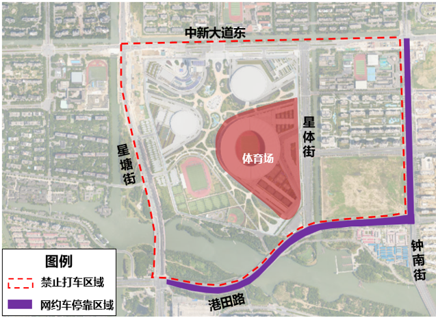 在散场时,钟南街(中新大道-港田路)、港田路(钟南街-星塘街)将设置为网约车临时停靠点位。球迷可在指定位置乘坐网约车离场,减少等待时间。