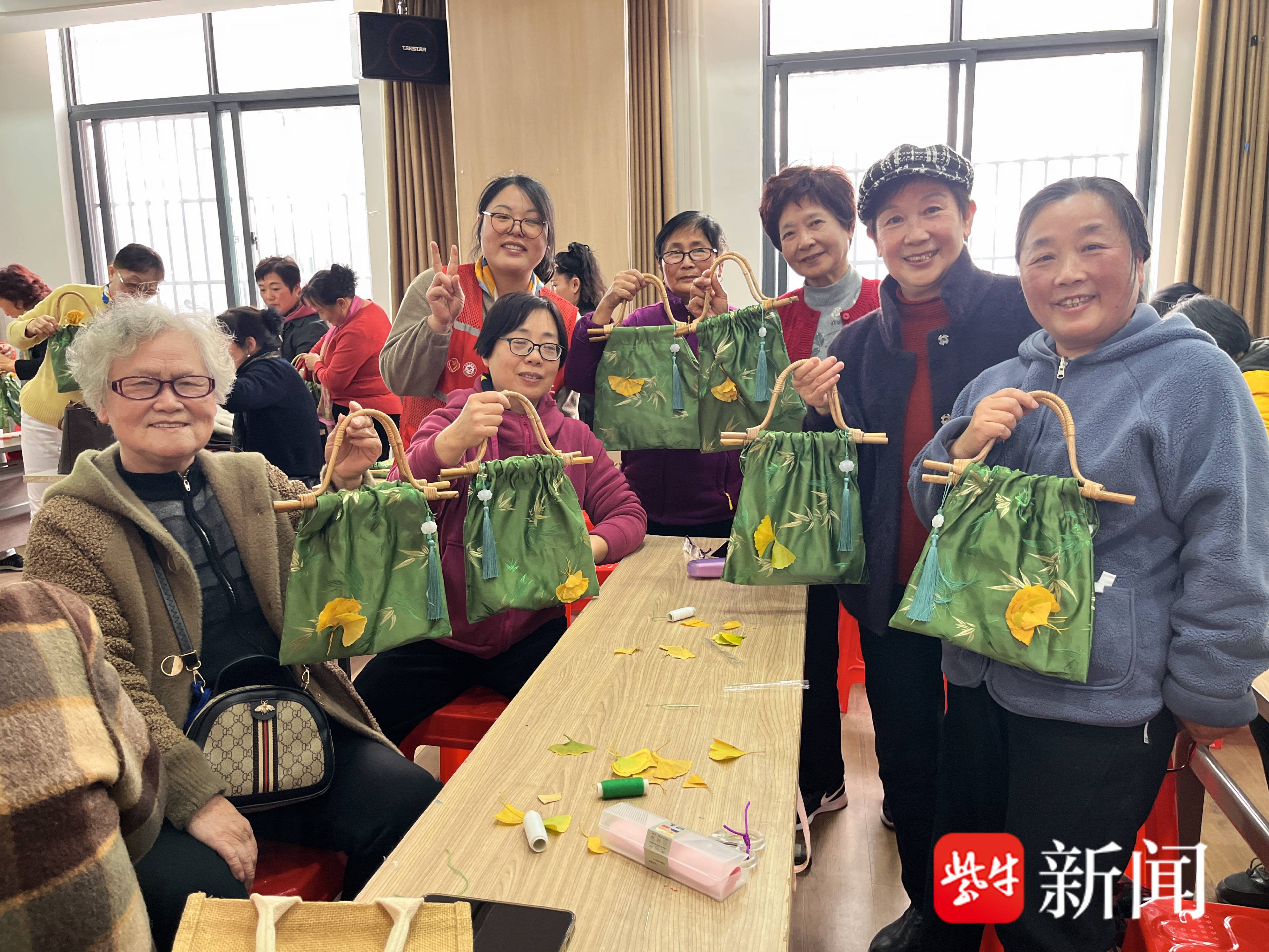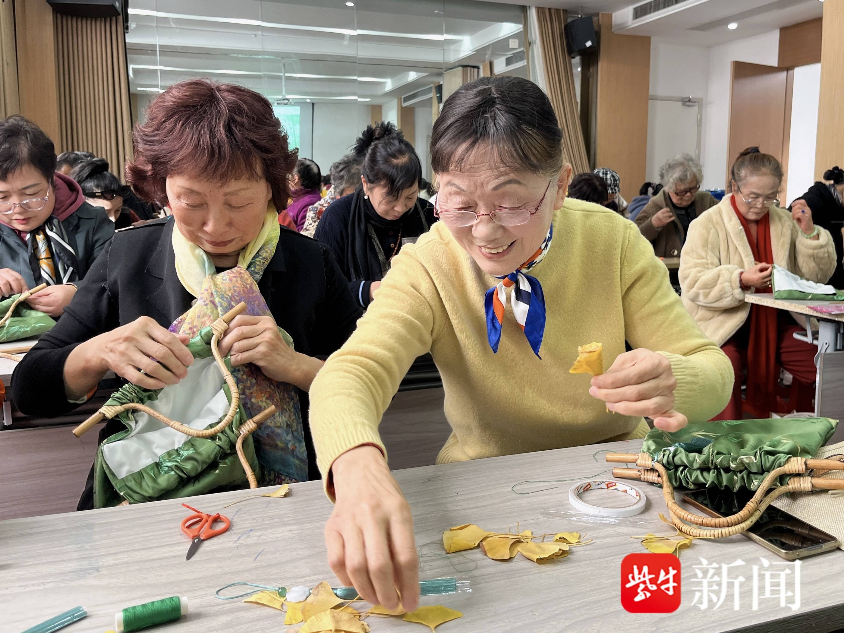 崔阿姨用银杏叶做成玫瑰花状点缀于宋锦包上,满心欢喜地说:“跟着邻居们动手做包包,把银杏叶卷成玫瑰缝在上面,既环保又雅致,落叶也能变宝贝啦!”新沧社区让银杏叶成为文化载体,在一针一线、一剪一贴中,将传统文化与当代生活无缝衔接,让古城的秋日既有风景之美,更有文化之韵。