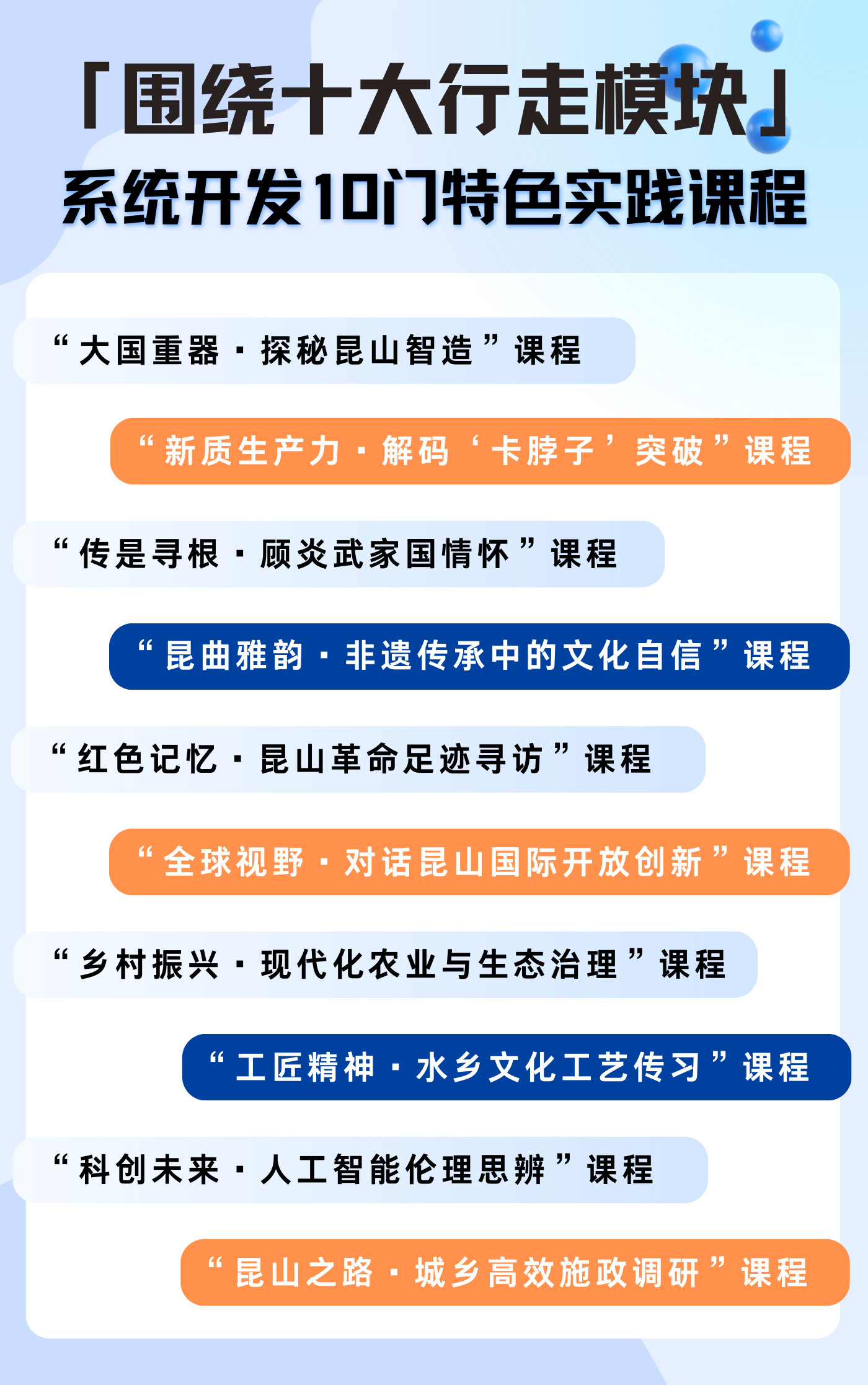该校基于昆山本地资源,系统梳理出“大国重器”“新质生产力”“传是寻根”“昆韵雅集”“红色记忆”“全球视野”“乡村振兴”“工匠精神”“科创未来”“治国理政”等十大主题模块。