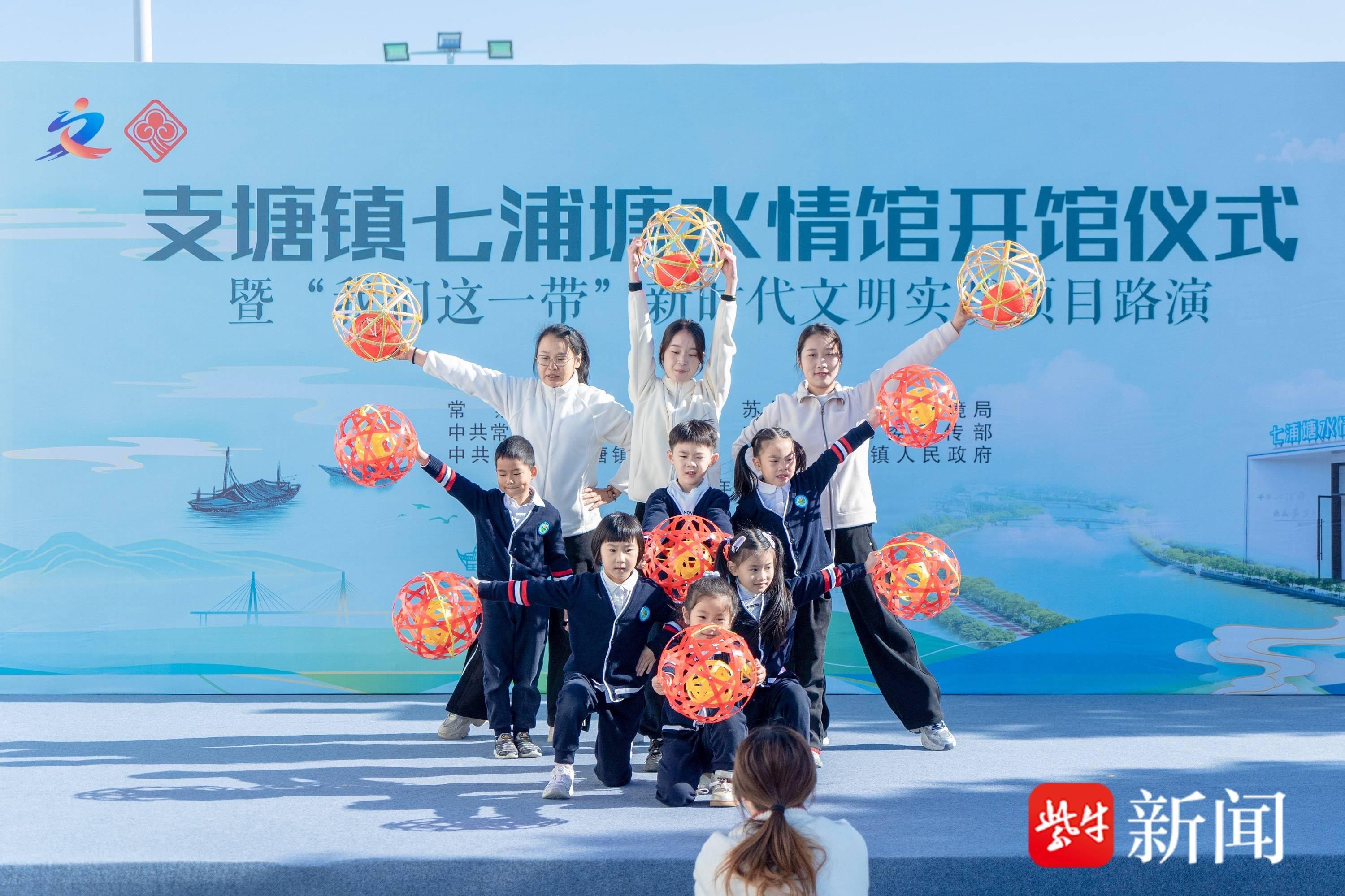11月18日,常熟支塘镇任阳社区七浦塘畔,一座占地350平方米的水情馆刚刚揭牌。馆内四大展陈篇章回溯着这条河道从明代抗倭驻防到当代生态治理的千年变迁,而馆外广场上,“我们这一带”新时代文明实践项目路演的压轴节目,是张青莲幼儿园师生带来的《灯舞映七浦》展演。