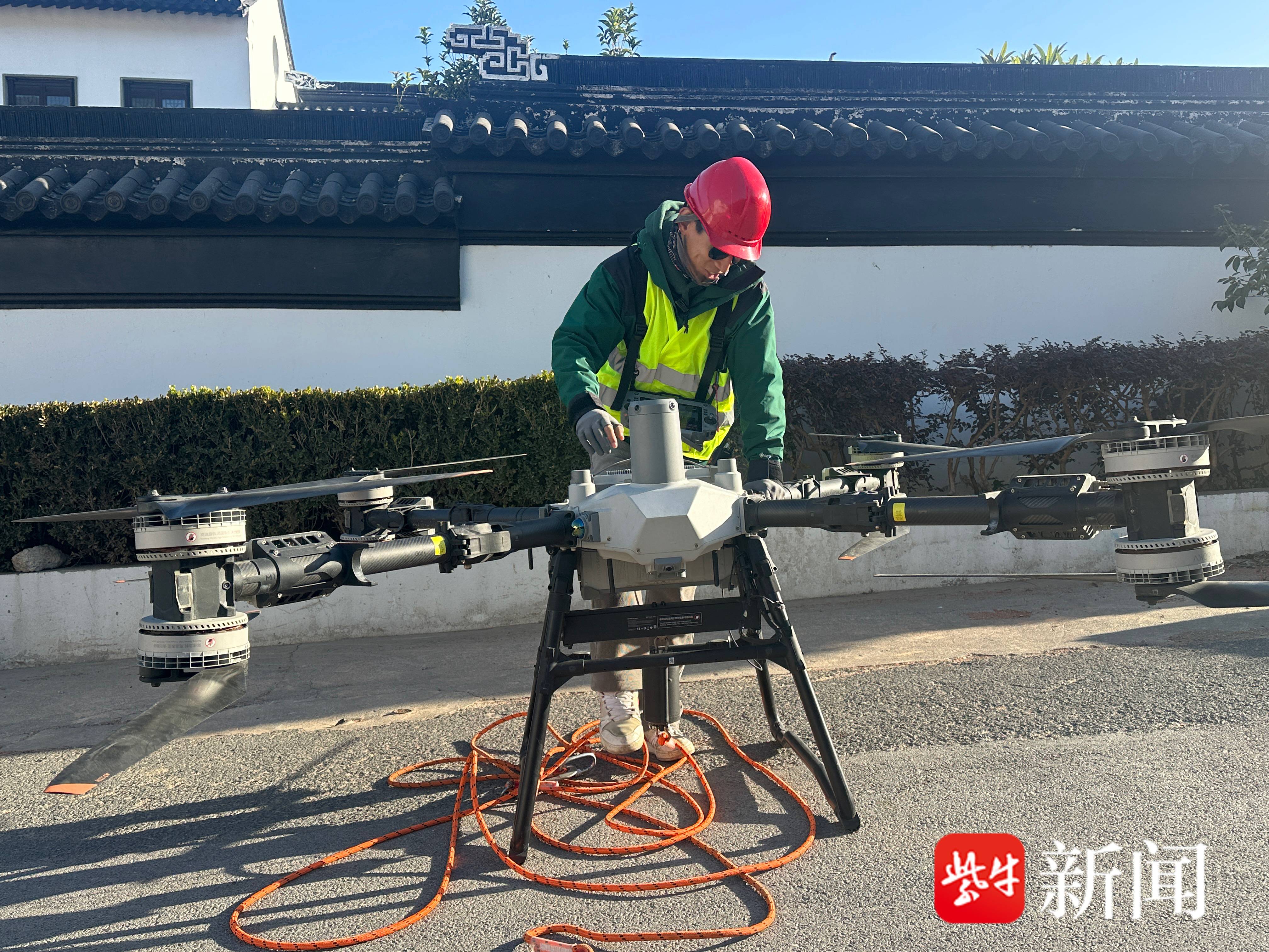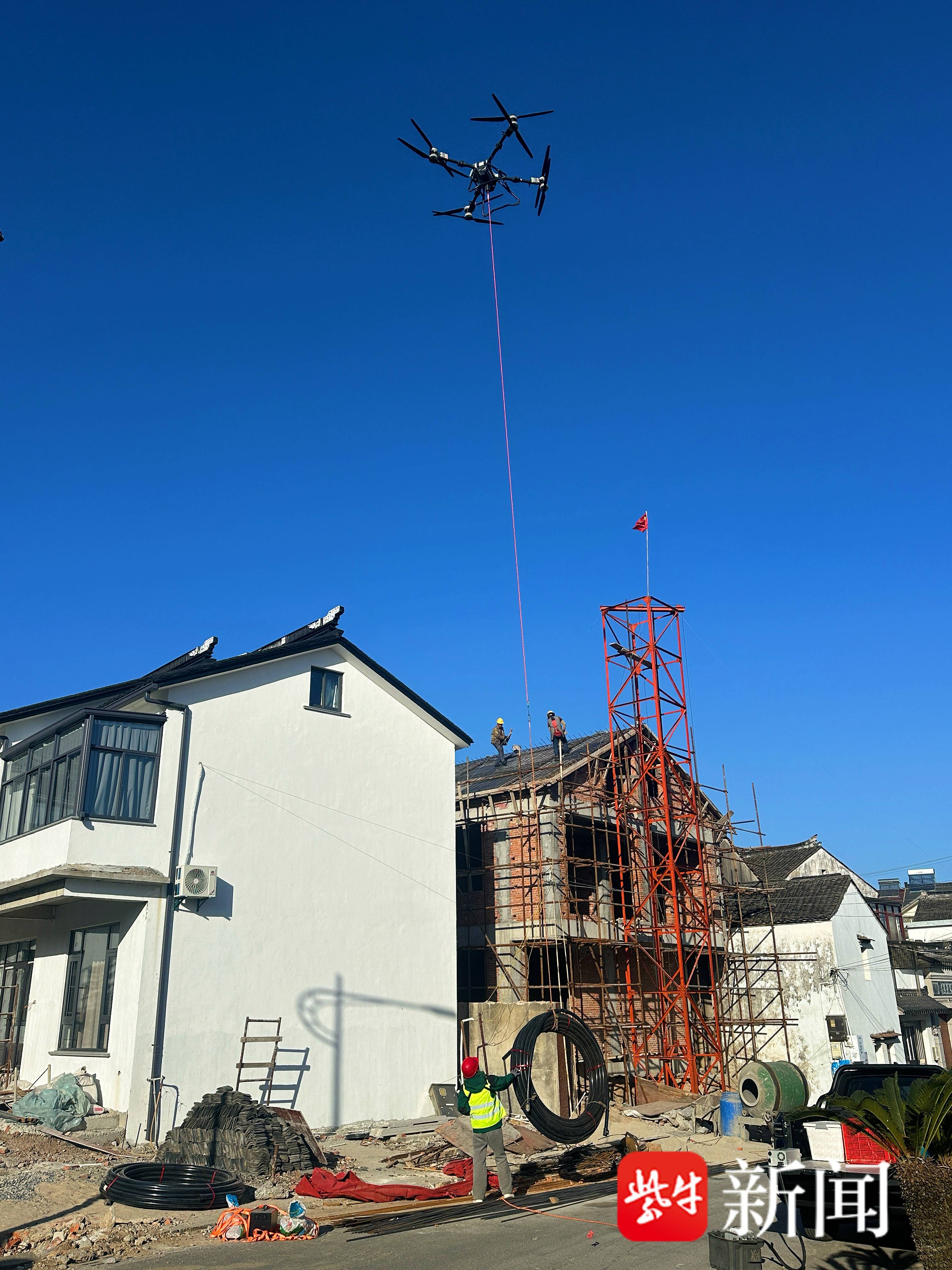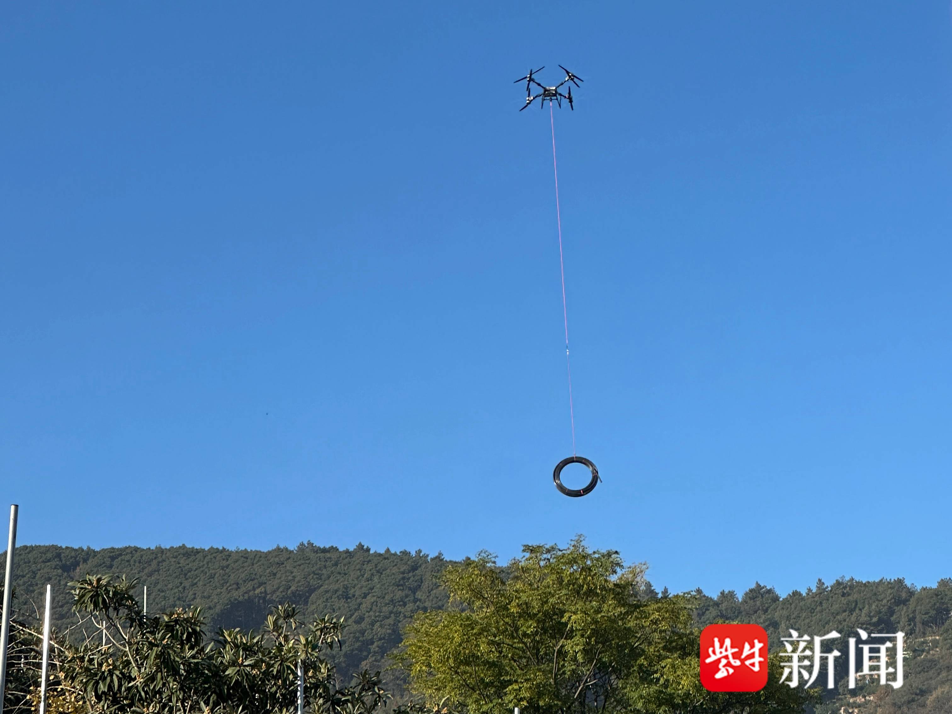 “嗡嗡!” 早晨 8 点,苏州东山脚下,一架银灰色无人机腾空而起,机身下方吊挂着一圈圈软管。随后它沿着预设航线灵巧飞行,不到两分钟,枇杷架建材就精准送达山上。