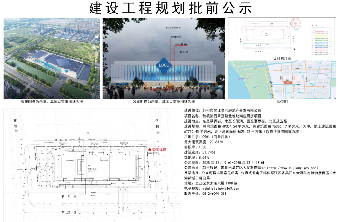 近日,项目建设工程规划批前公示发布。公示显示,项目总用地面积49354.54平方米,总建筑面积76376.17平方米,其中,地上建筑面积67750.45平方米,地下建筑面积8625.72平方米。最大建筑高度23.83米。