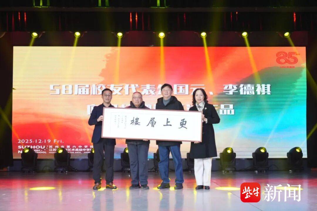 苏州六中85年办学历程中培养出包括两位85岁同龄院士在内的大批优秀人才,33年艺术特色办学成果丰硕。1958届校友程耿东院士特地录制了一段祝福视频寄语母校。现场,校友朱国元、李德祺代表全体58届校友向母校赠送书法作品。
