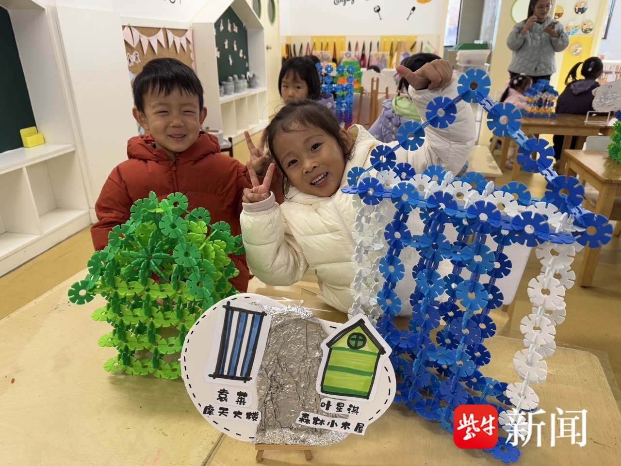 瞧,孩子们的小手正忙碌着……乐高块轻轻扣紧,雪花片拼成小花,积木叠成小塔。