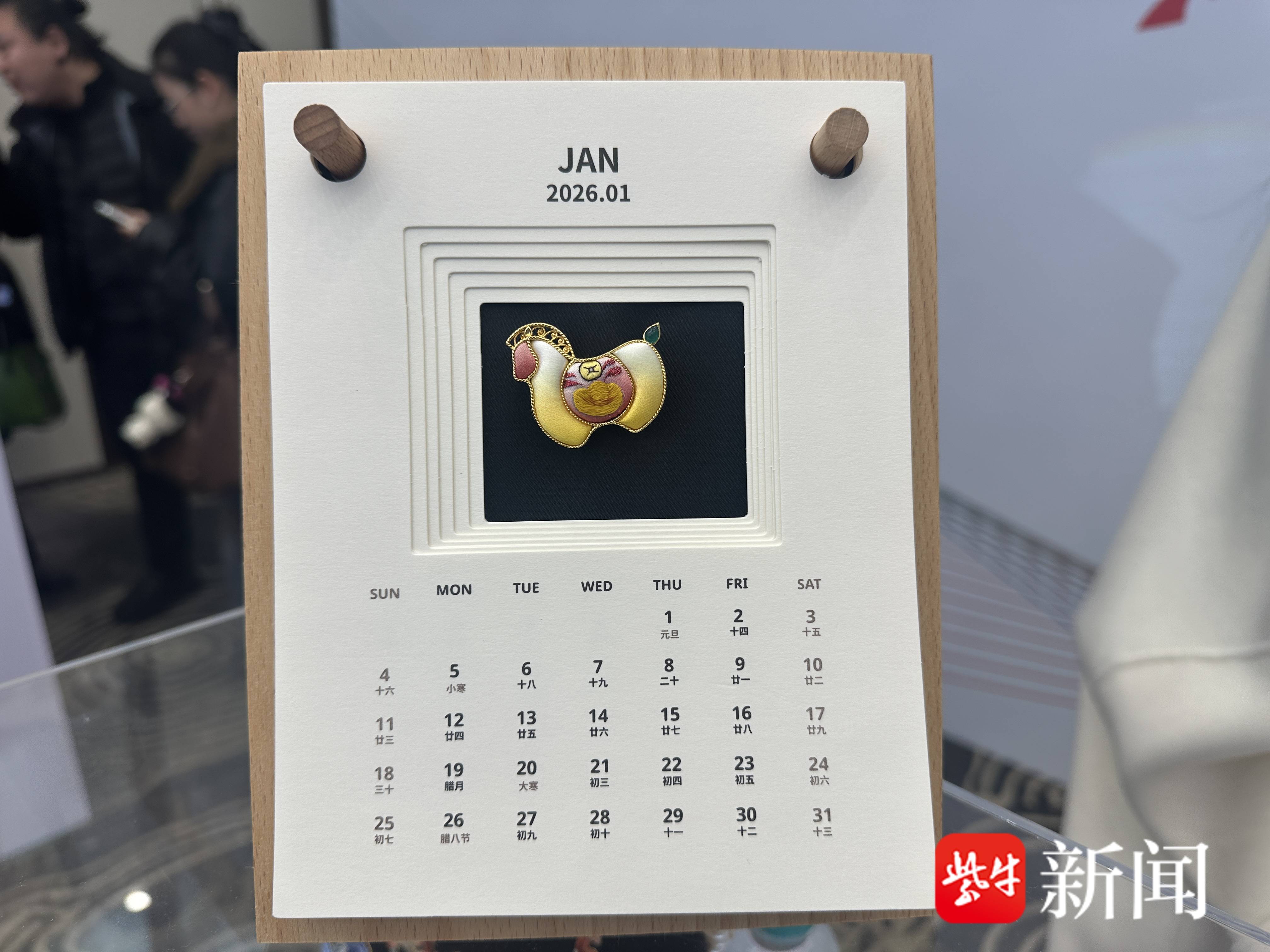“这枚胸针其实来自我们设计的2026新年苏绣台历—,饰片可轻松取下,直接当作胸针佩戴。”设计师岳琰站在展台旁介绍,台历上的骏马图案以传统苏绣技法绣制,俯视时形似元宝,寓意“马上有钱”“马上有福”。她和团队特意采用可拆卸结构,“让一件作品既服务时间记录,又成为日常配饰。”