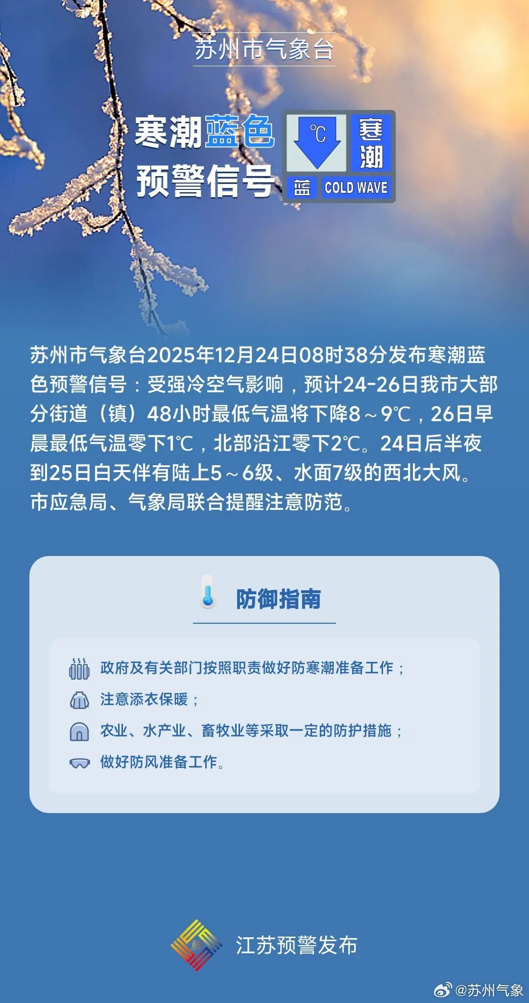 受强冷空气影响,预计24-26日苏州市大部分街道(镇)48小时最低气温将下降8~9℃,26日早晨最低气温零下1℃,北部沿江零下2℃。24日后半夜到25日白天伴有陆上5~6级、水面7级的西北大风。市应急局、气象局联合提醒注意防范。