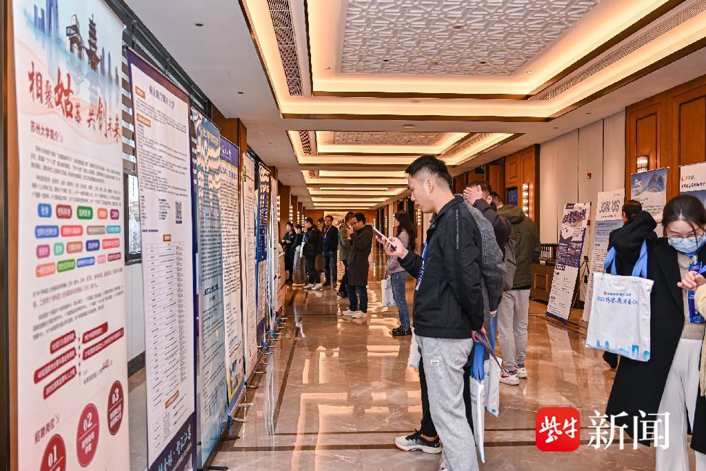 在人才项目交流对接会上,苏州大学、南京航空航天大学、河海大学、徐州医科大学、江苏亨睿碳纤维科技有限公司等40家高校、科研院所、侨资企业参与了人才项目对接交流,围绕生物医药、人工智能、新一代电子信息、智能先进装备、新能源、新材料等战略性新兴产业共发布千余个相关专业岗位。活动现场,各展位前人头攒动,青年学者们积极咨询岗位需求、投递简历。部分学者受到用人单位邀请,将分赴苏州、南京、南通等市意向单位进一步精准对接,共同探寻与江苏深度合作的契机。