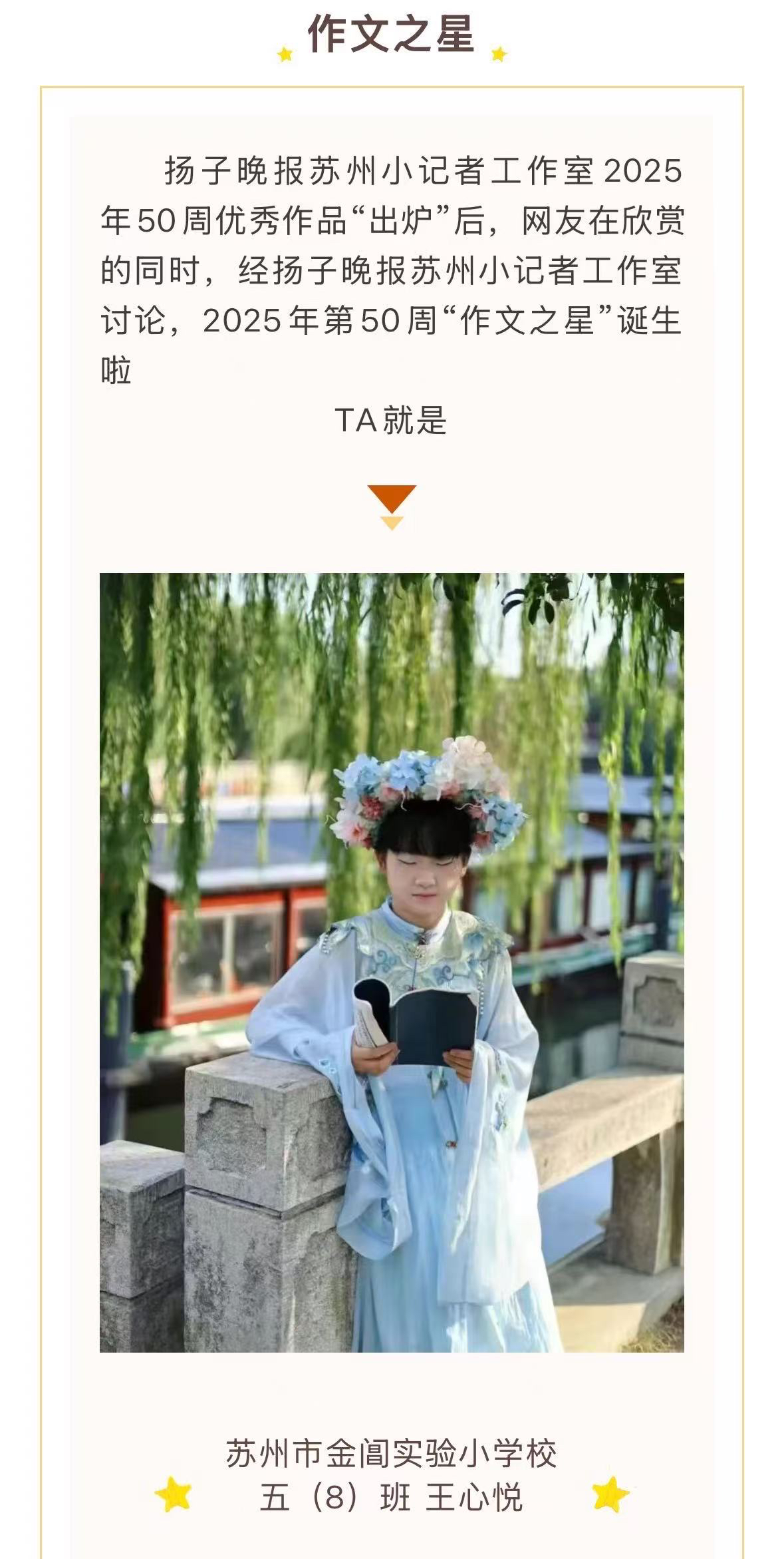 “它的身高约30厘米,全身的绒毛细腻柔顺,像云朵一样好摸,眼睛是两颗乌黑的纽扣,还有着像小狗一样的鼻子和鲜红的樱桃小嘴。”苏州市金阊实验小学校五(8)班王心悦的习作《“独特”的小白熊》,以细腻笔触描摹童年伙伴,用真挚情感诉说陪伴故事,获评扬子晚报小记者工作室第50周“作文之星”的荣誉称号。