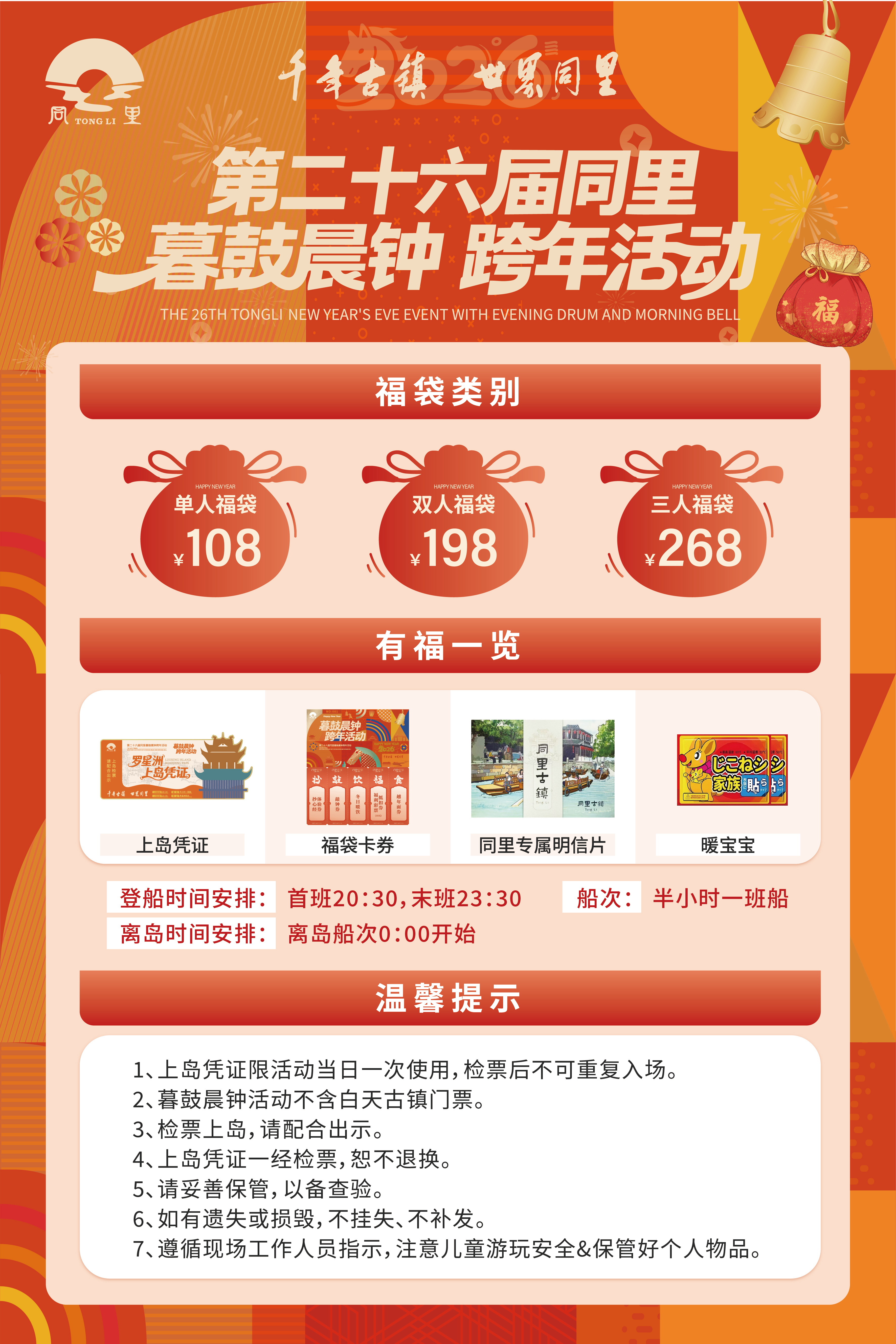 本次活动面向市民游客销售“暮鼓晨钟福袋”约500份(包含网络提前预售、现场销售),单人福袋108元/份,双人福袋198元,三人福袋268元。套餐内容含罗星洲上岛凭证、越年面券、敲钟券、抄心经体验劵。