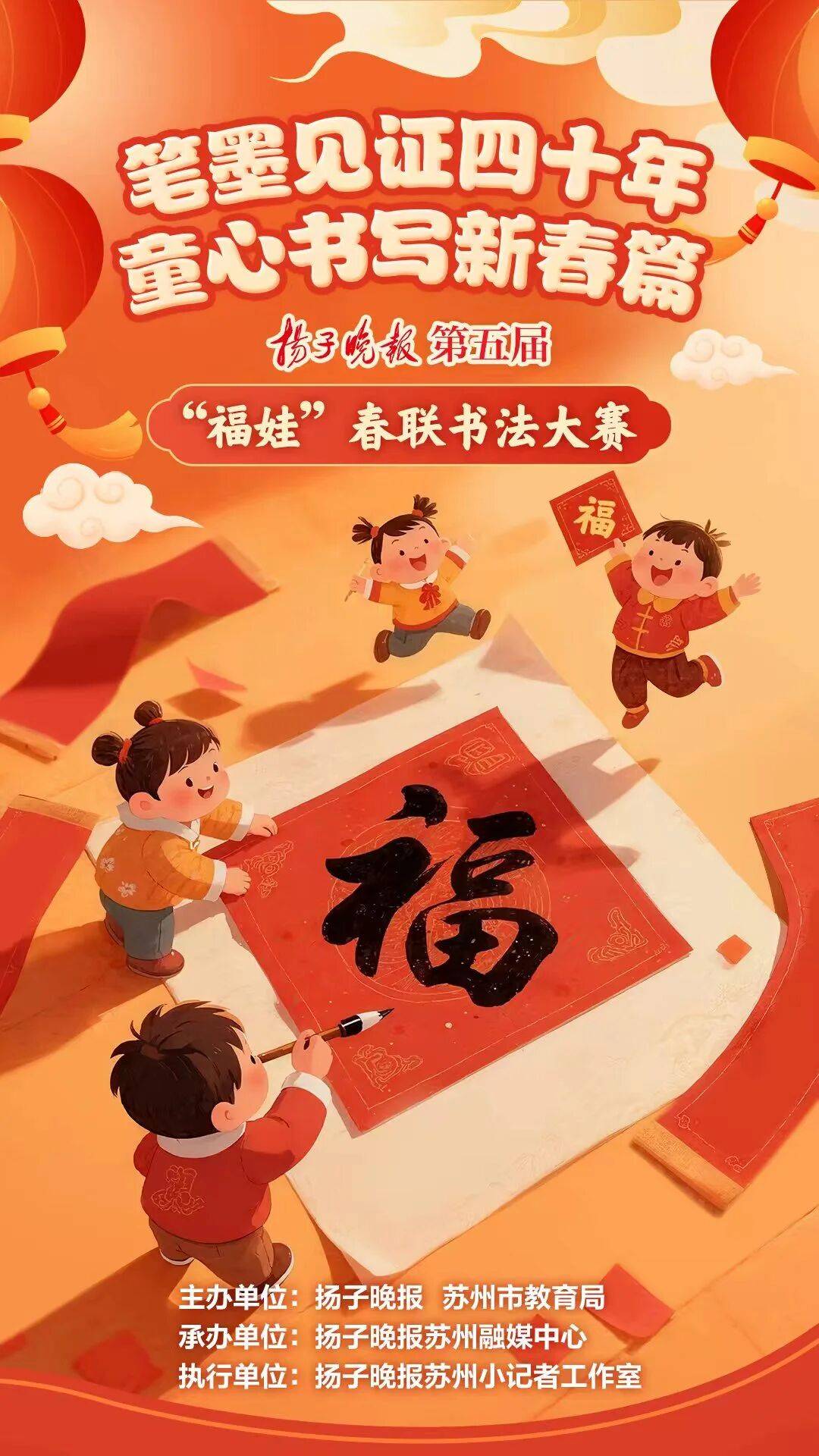 1. 主办方将邀请知名书法家与获奖小朋友大手牵小手,走进苏州古典园林、商圈、乡镇街道、街巷社区等地,开展现场春联书写、赠福及义卖活动(报名参加第五届“福娃”春联书写大赛的小朋友,即默认为获奖后将积极配合主办单位组织的线下现场书写展示、义卖等活动)。
