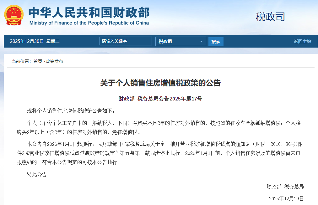 近日,财政部网站发布关于个人销售住房增值税政策的公告。
