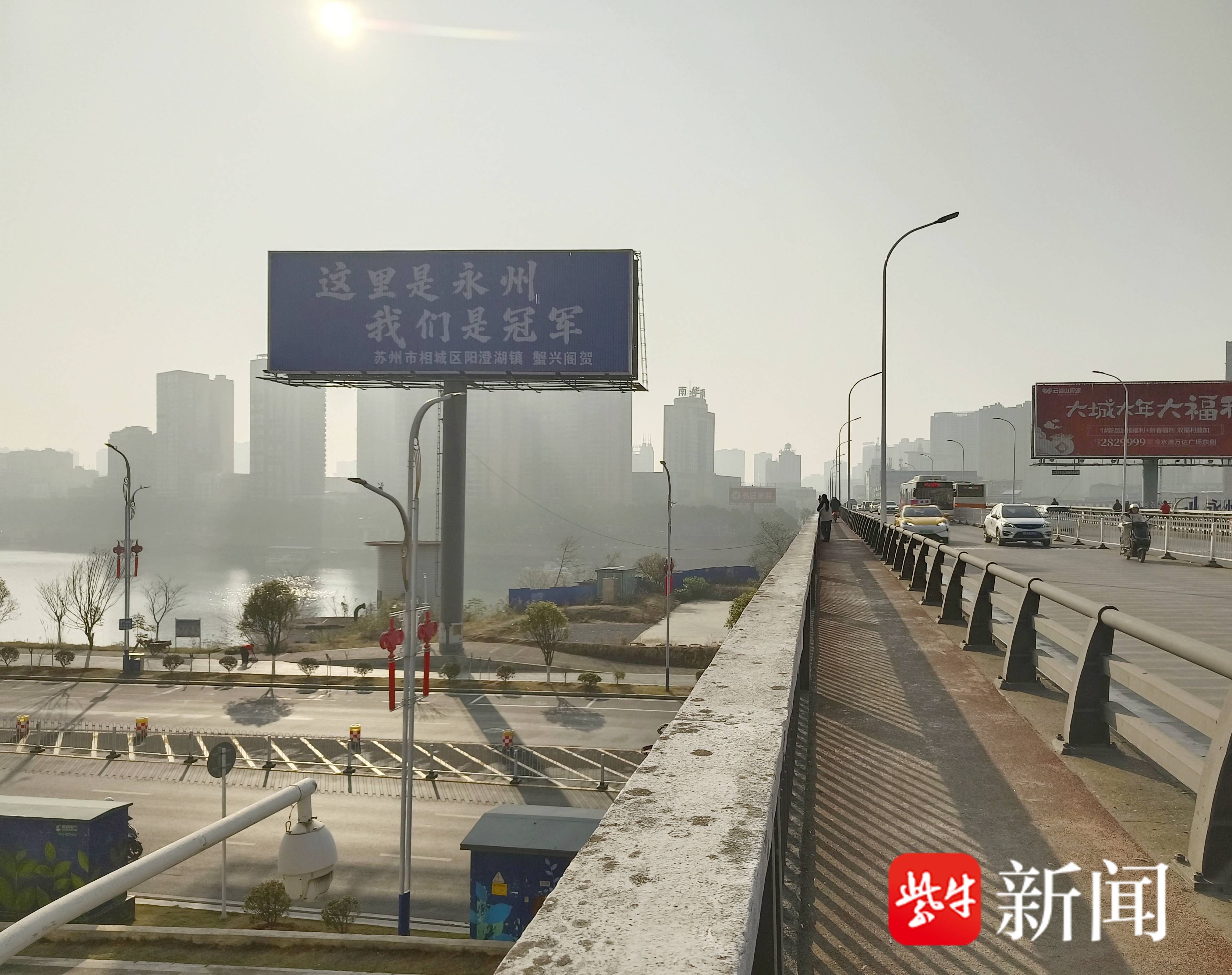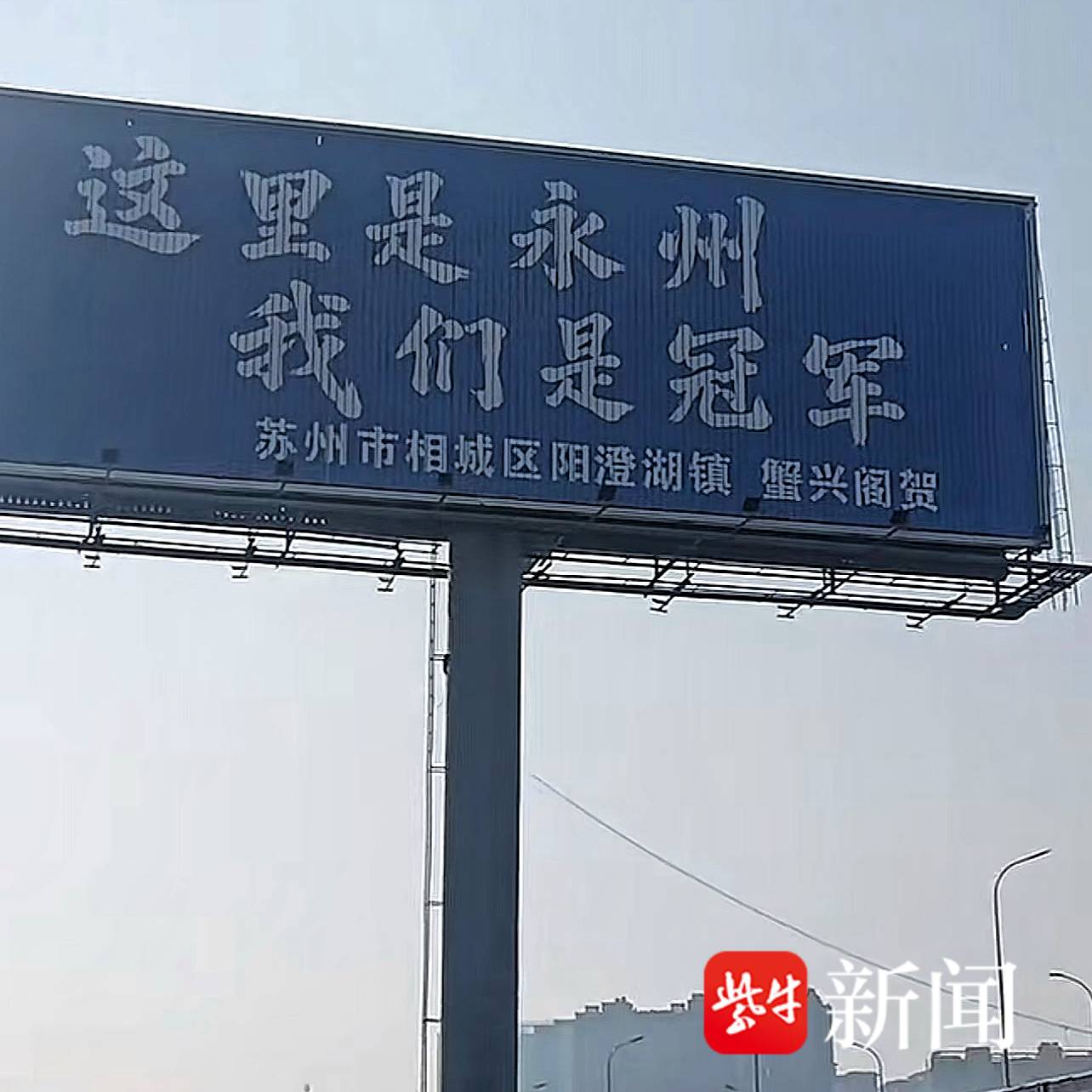 1月6日上午,他迅速联系广告公司,在永州街头投放了一块署名“苏州市相城区阳澄湖镇”的应援牌,标语则沿用苏州网友的统一口号:“这里是永州,我们是冠军。”