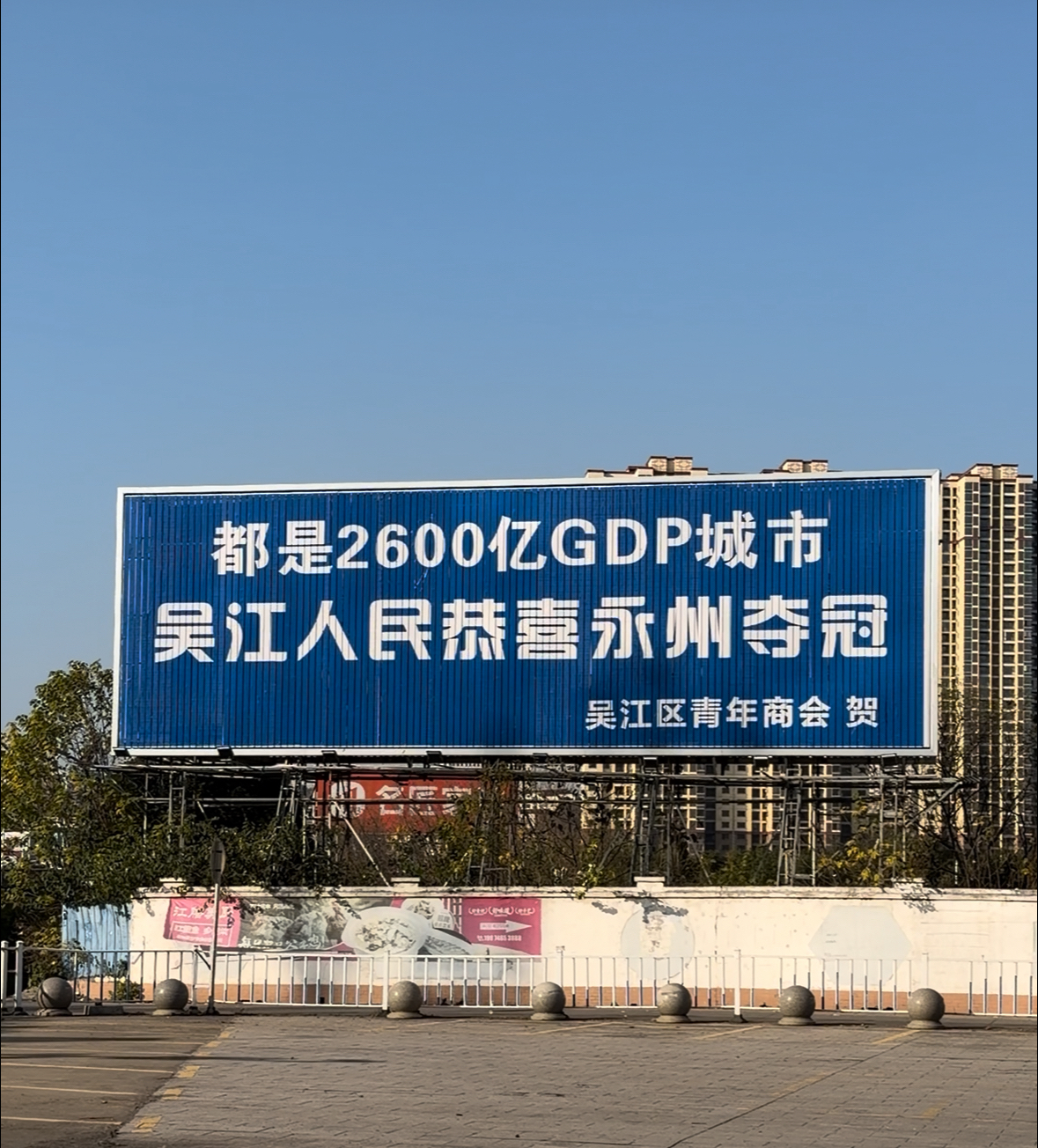 “都是2600亿GDP城市,吴江人民恭喜永州夺冠!”近日,在湖南永州潇湘大桥附近,一块醒目的巨幅广告牌悄然竖起,并迅速在网上掀起了一场关于“县域经济领头羊”与“城市精神共鸣”的热烈讨论。