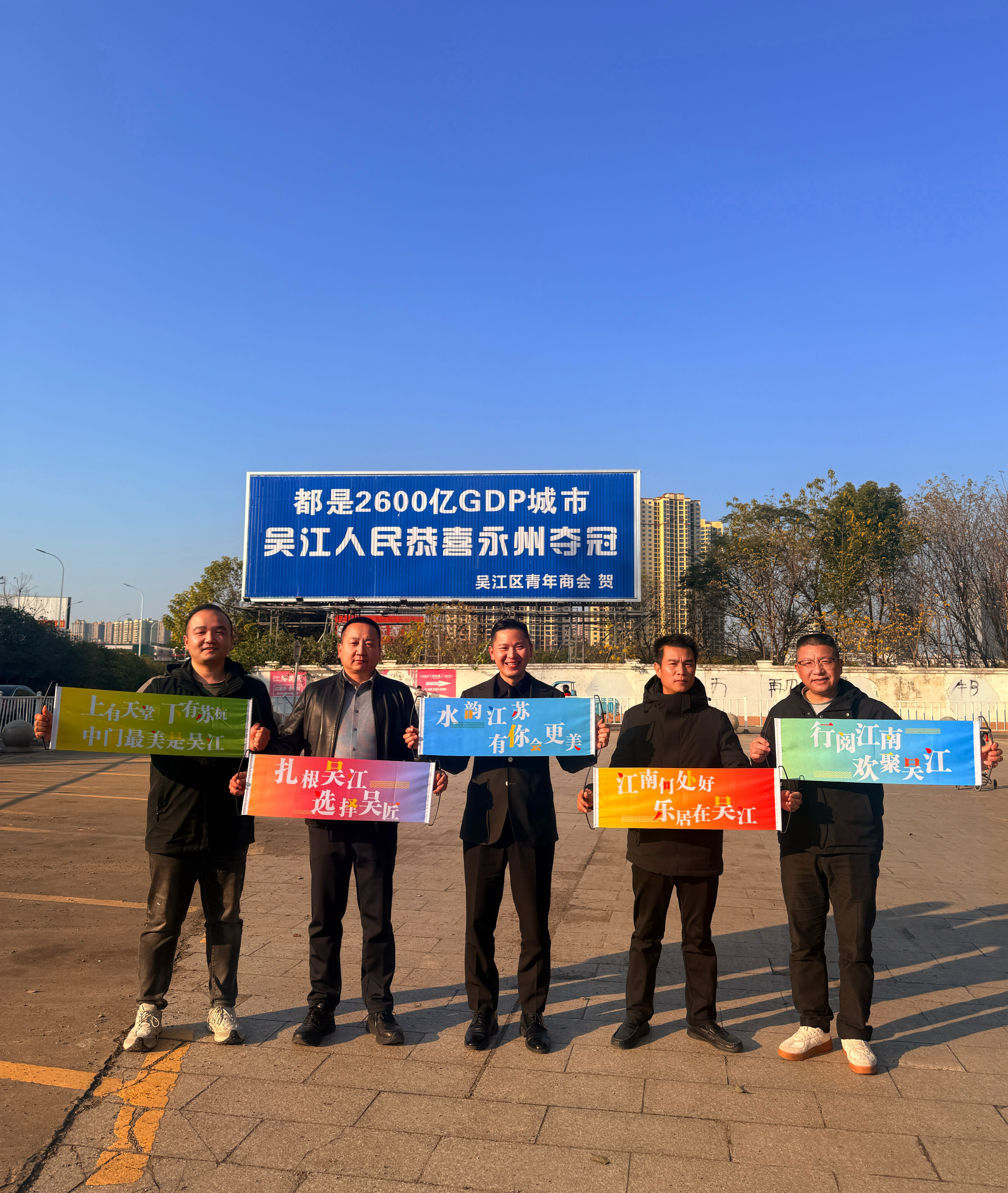 当江苏各地的祝贺牌以城市、乡镇甚至村庄的名义陆续出现在永州街头时,这块由吴江青年商会企业家陈忠慧自费投放的广告牌,却因为一个精准的数字对比而显得尤为特别。1月9日,在接受扬子晚报/紫牛新闻记者采访时,陈忠慧表示:“这不只是对湘超冠军的诚挚祝贺,更想说一句——你的拼搏,吴江的企业家们都懂。”